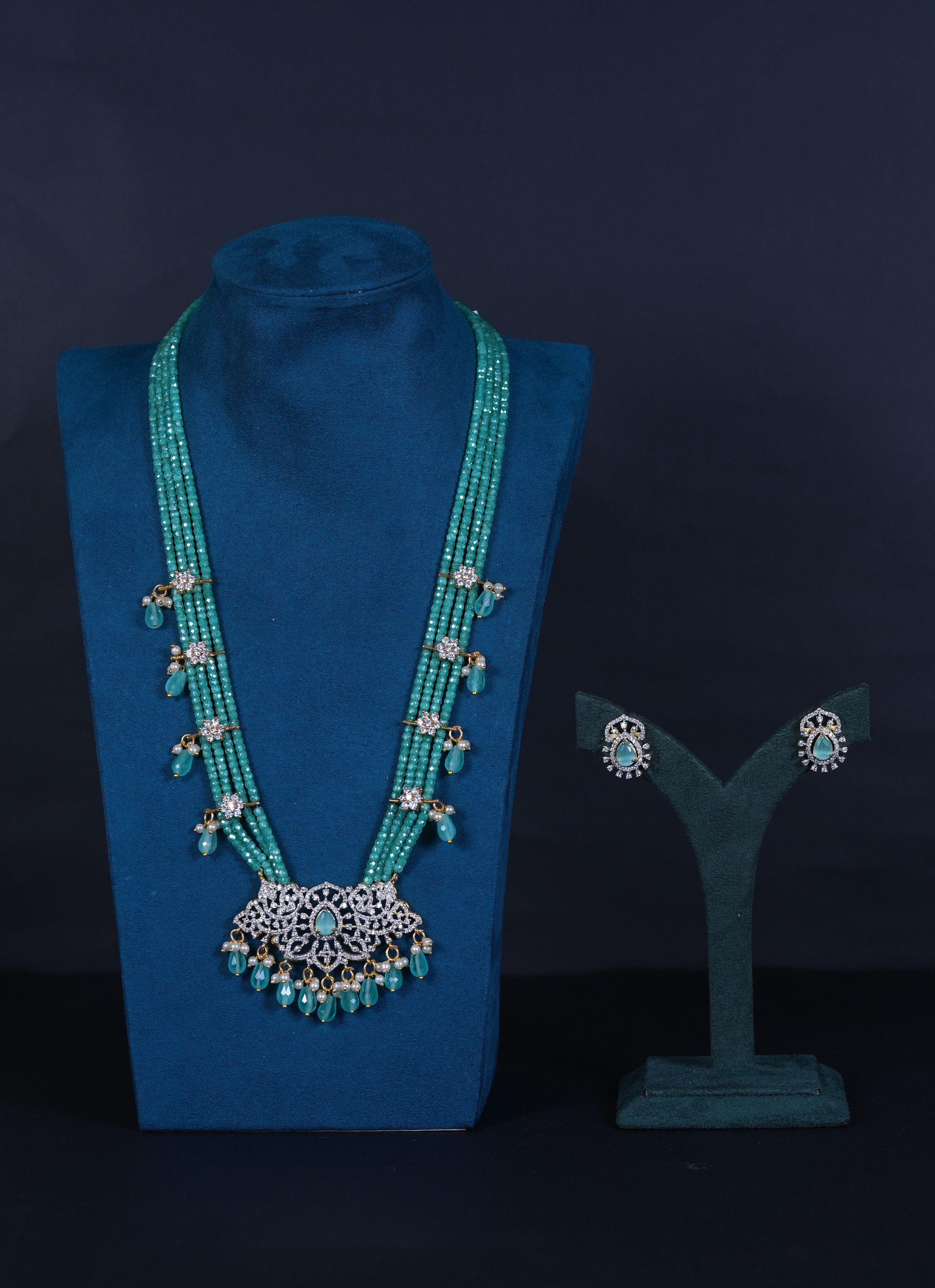 AD stone green beaded haram with matching earrings. An elegant imitation jewelry set combining radiant sparkle with rich green accents, perfect for weddings and festive occasions.