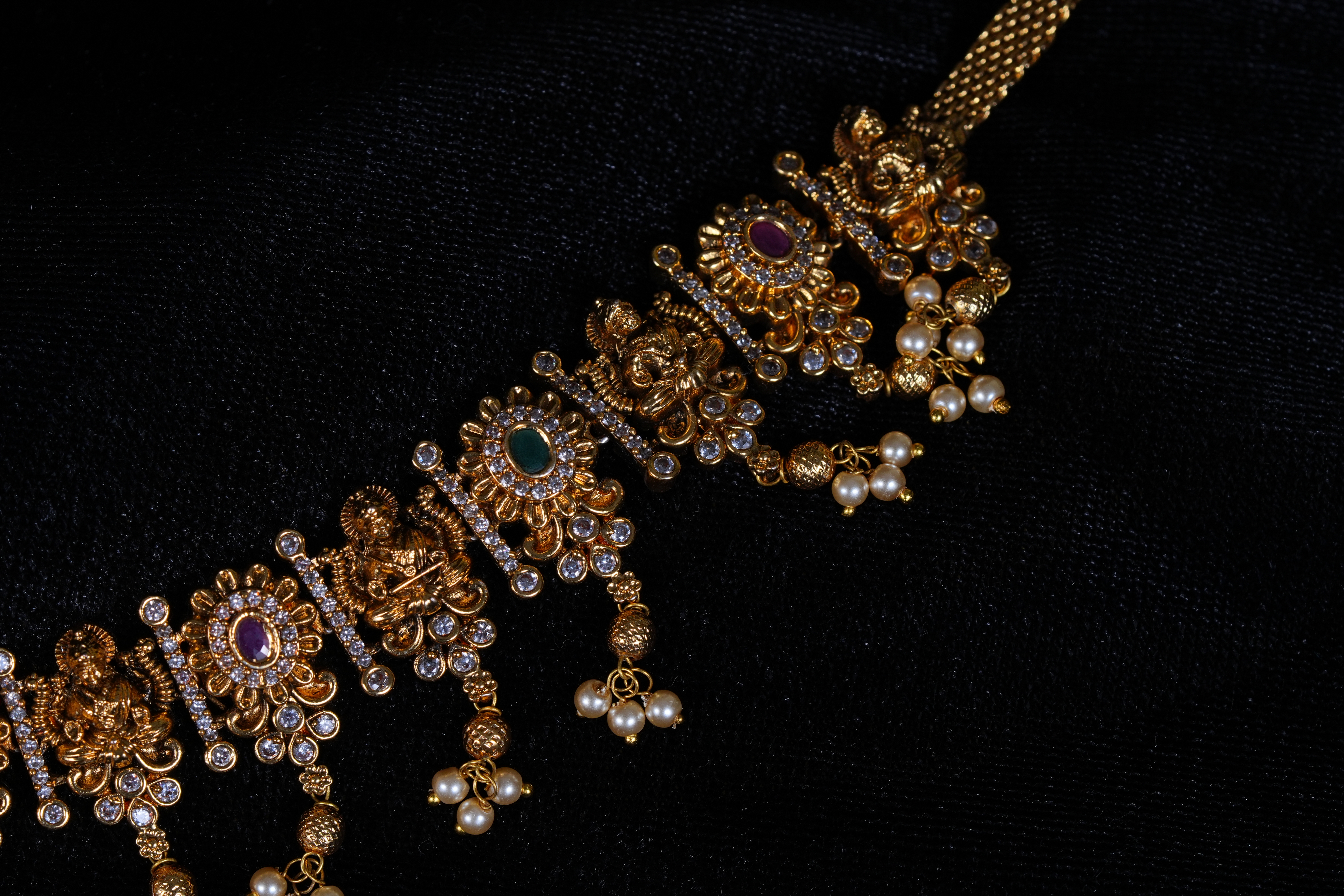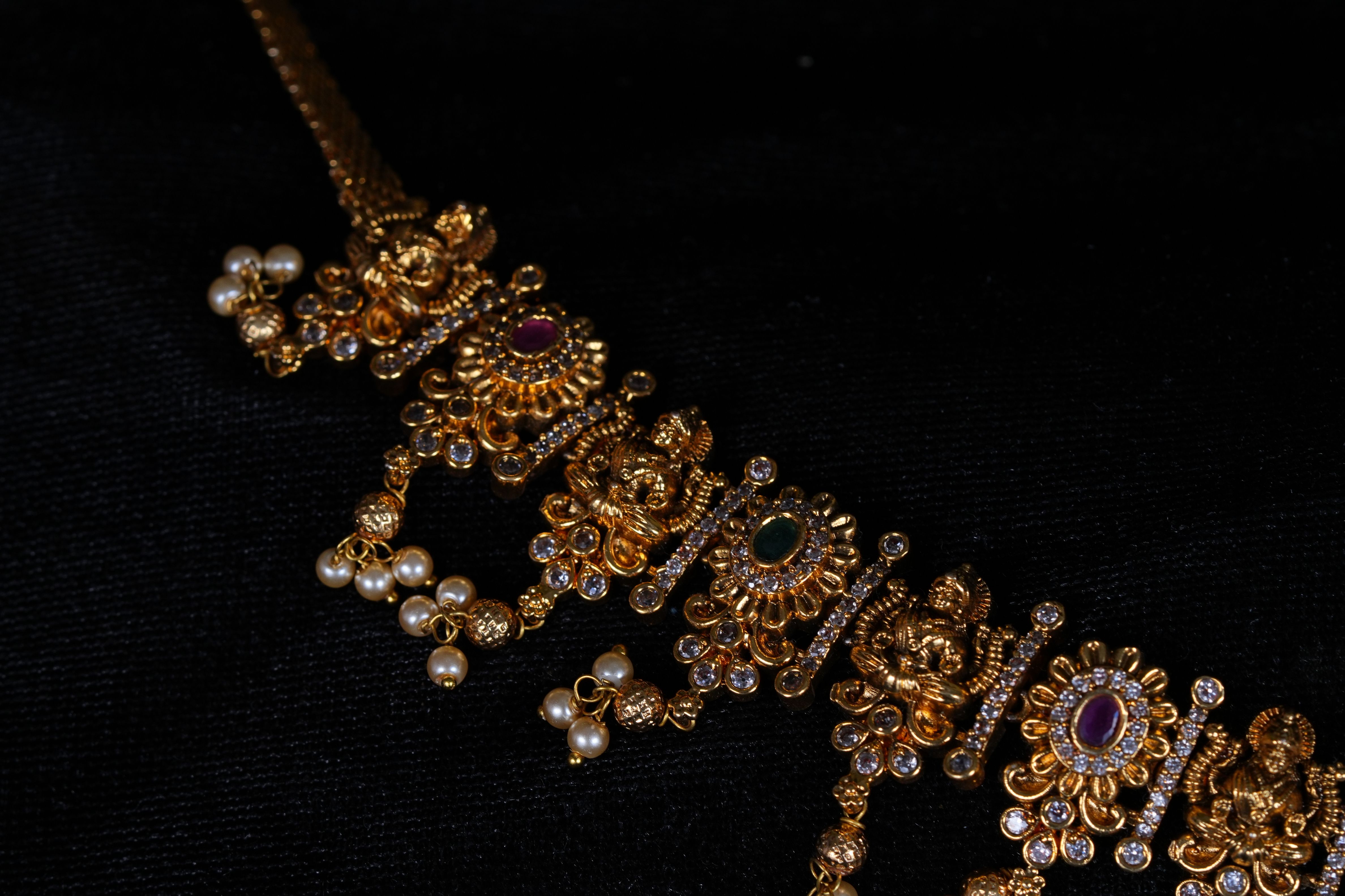 Antique Lakshmi Nakshi hip chain. A traditional imitation jewelry piece featuring detailed temple-inspired design, perfect for bridal and festive wear.