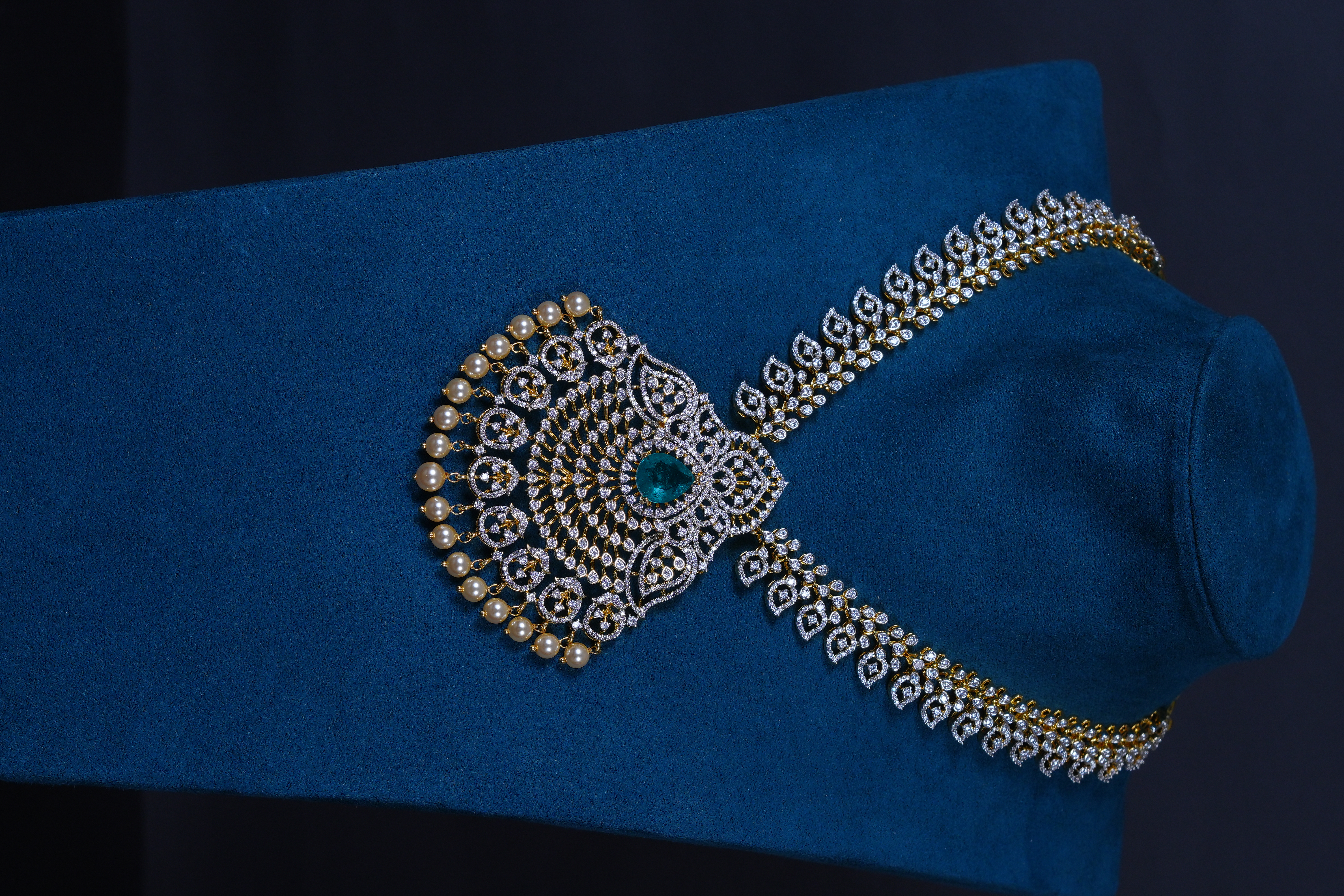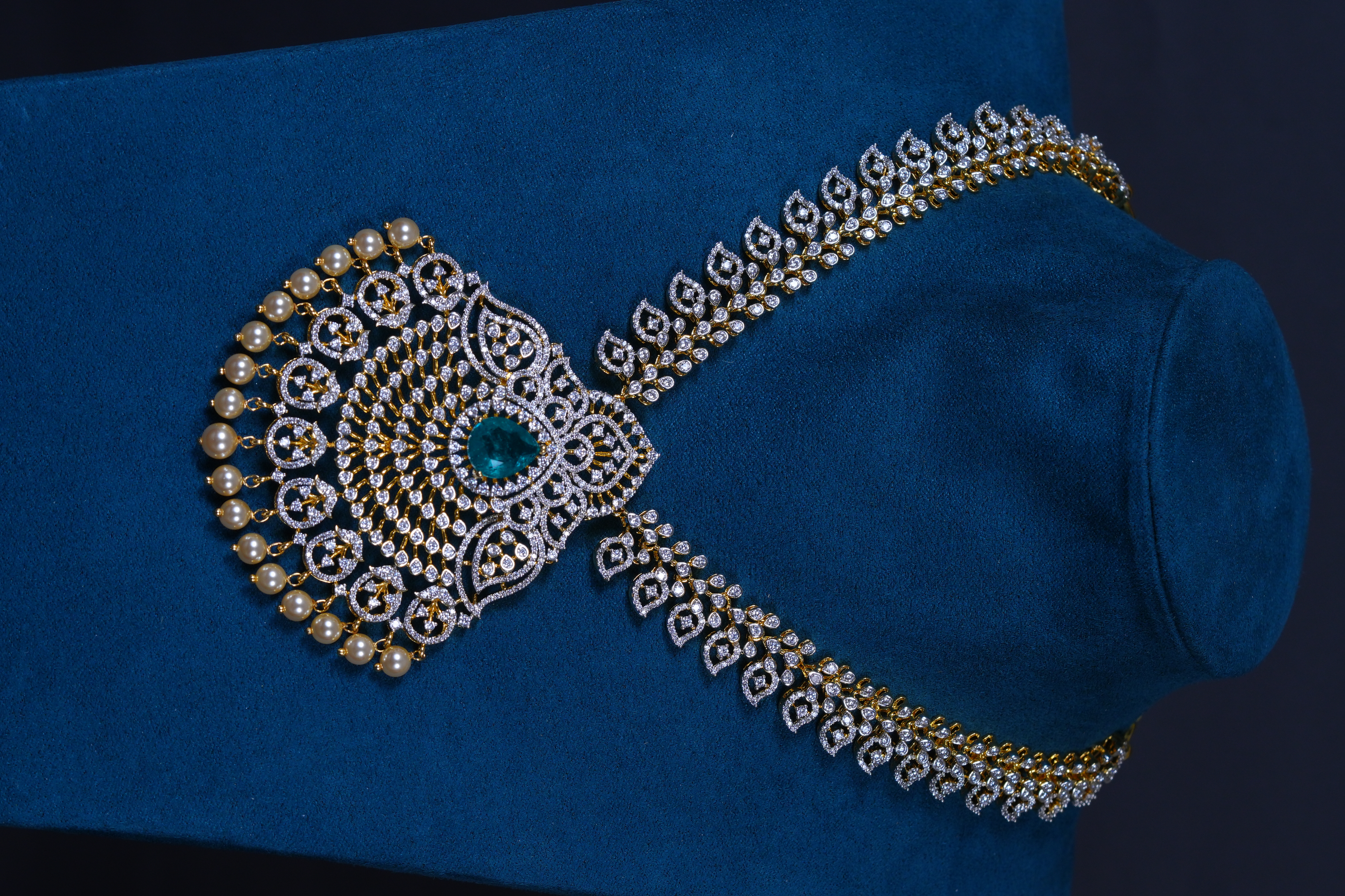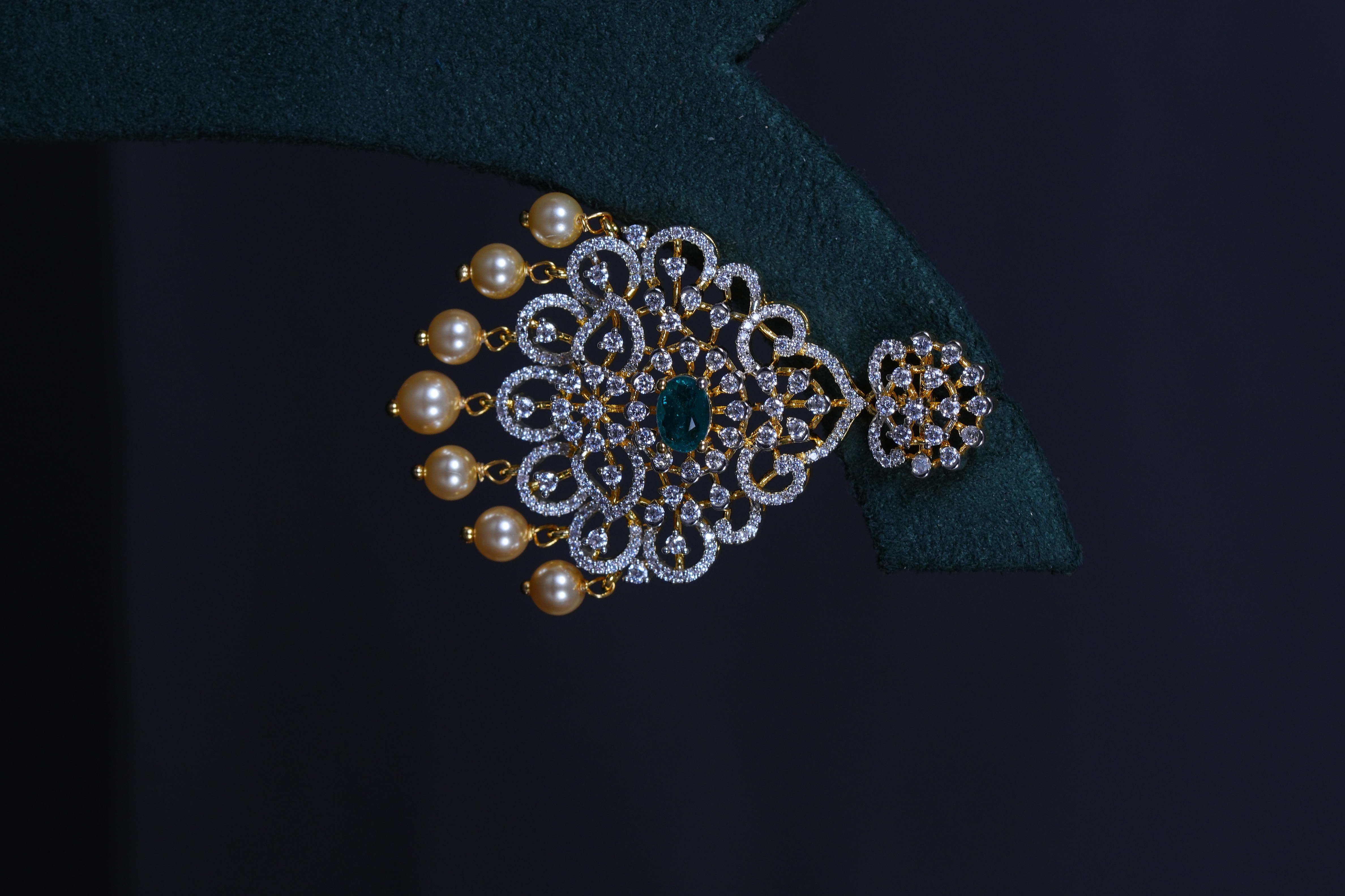 Emerald Mango American Diamond necklace with matching earrings crafted in 92.5 sterling silver. A traditional mango-motif design enhanced with radiant AD sparkle, perfect for weddings and festive occasions.