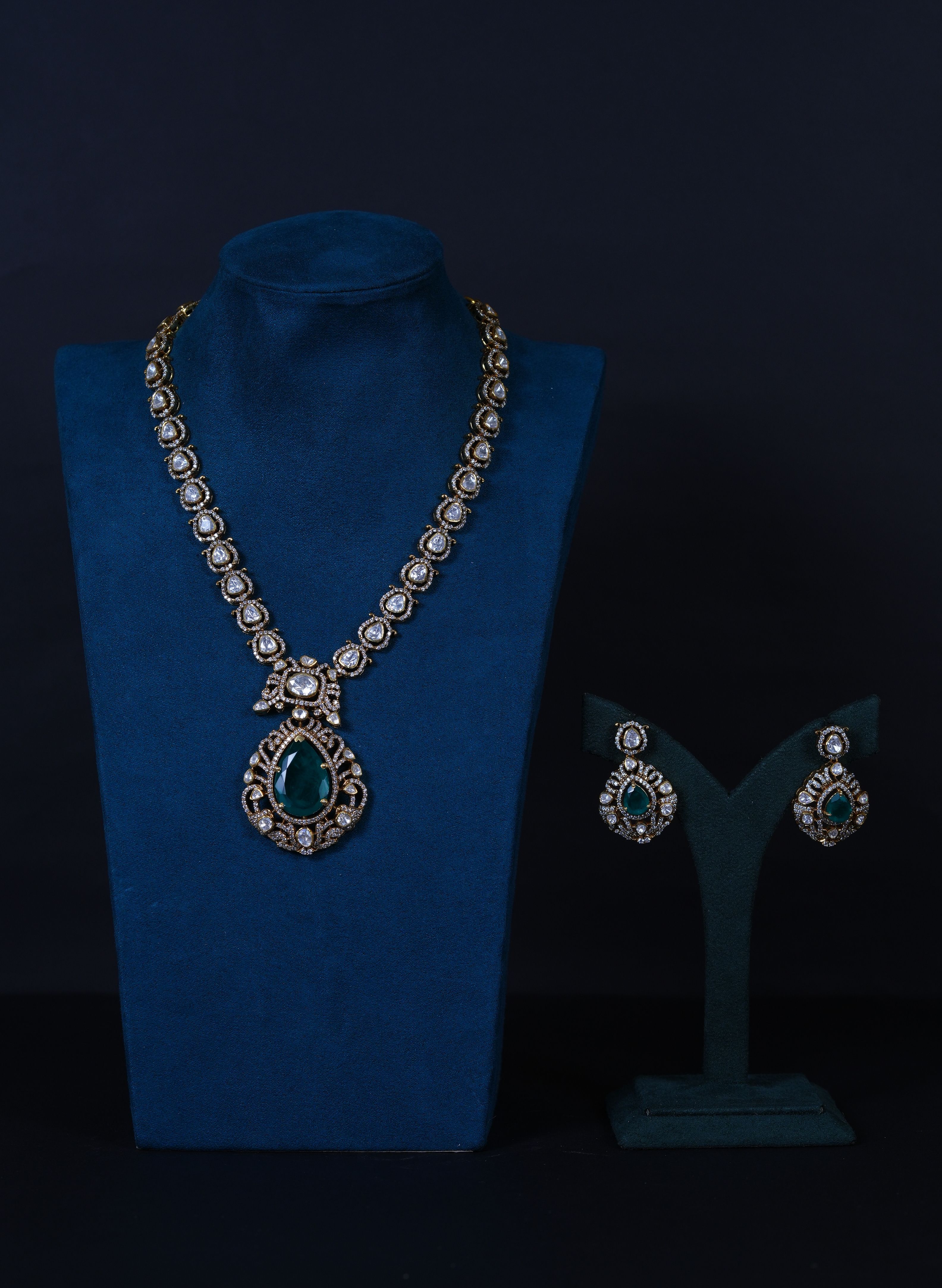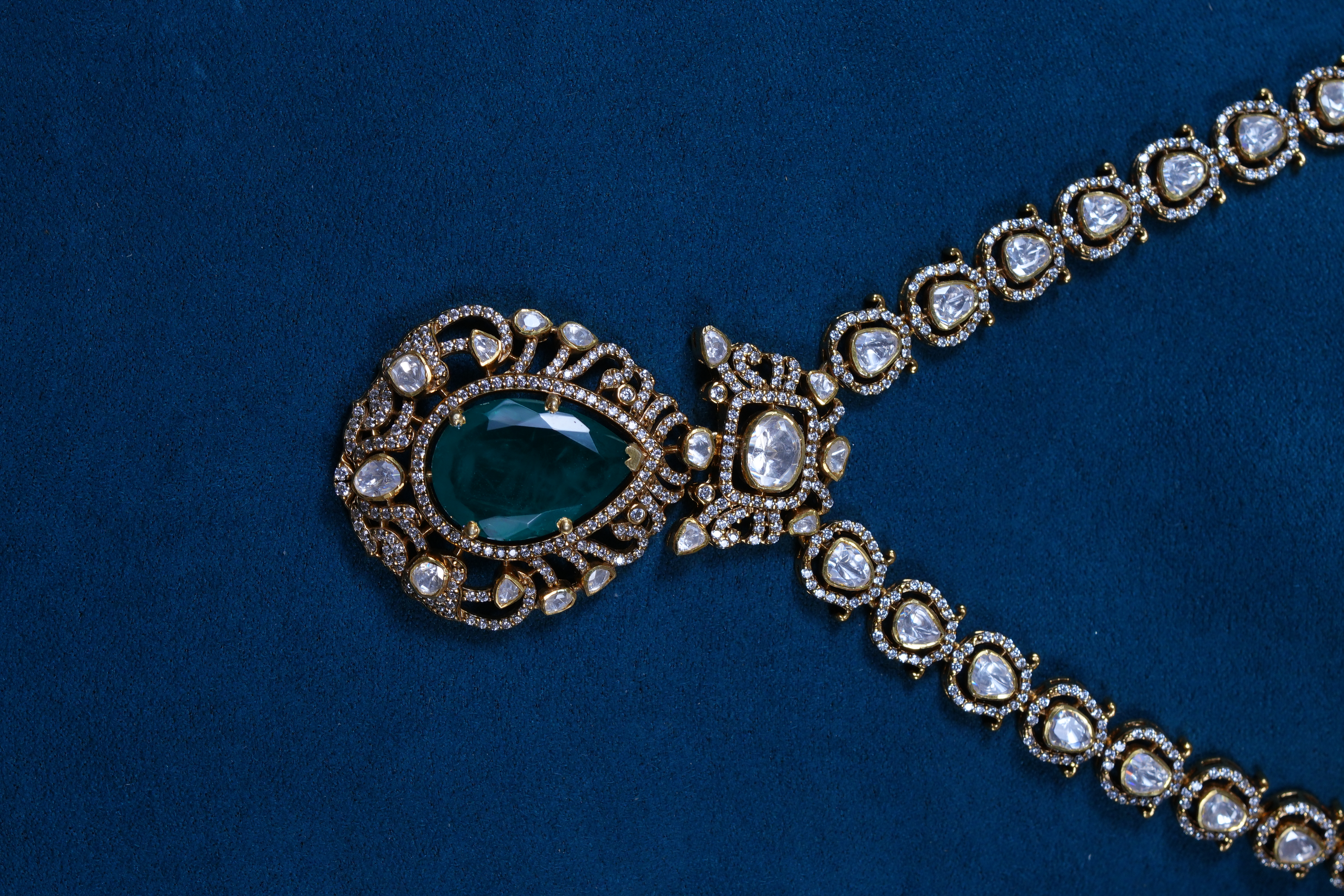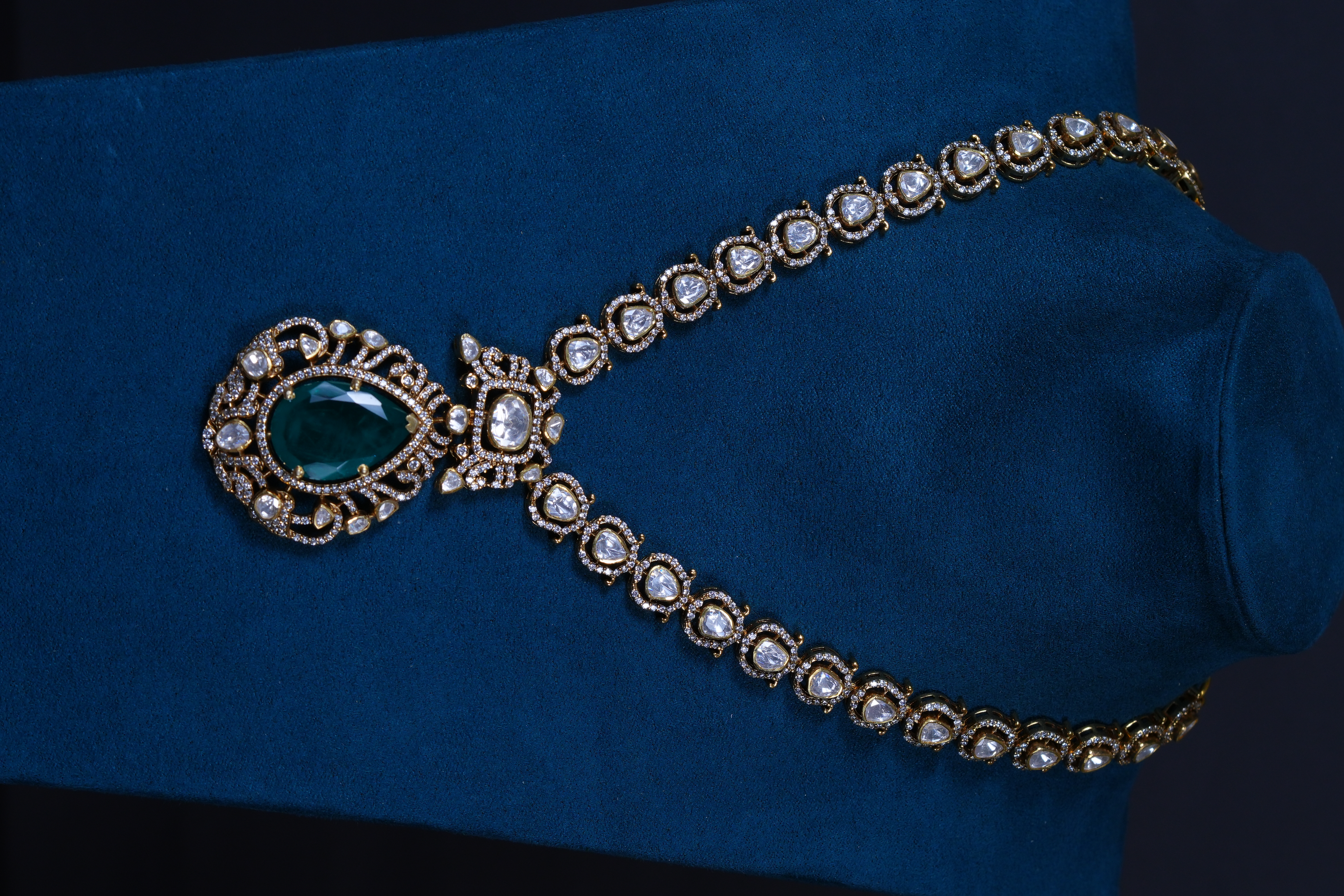 Emerald Polki necklace with matching earrings crafted in 92.5 sterling silver. A timeless blend of rich emerald tones and classic Polki detailing, perfect for weddings and festive occasions.