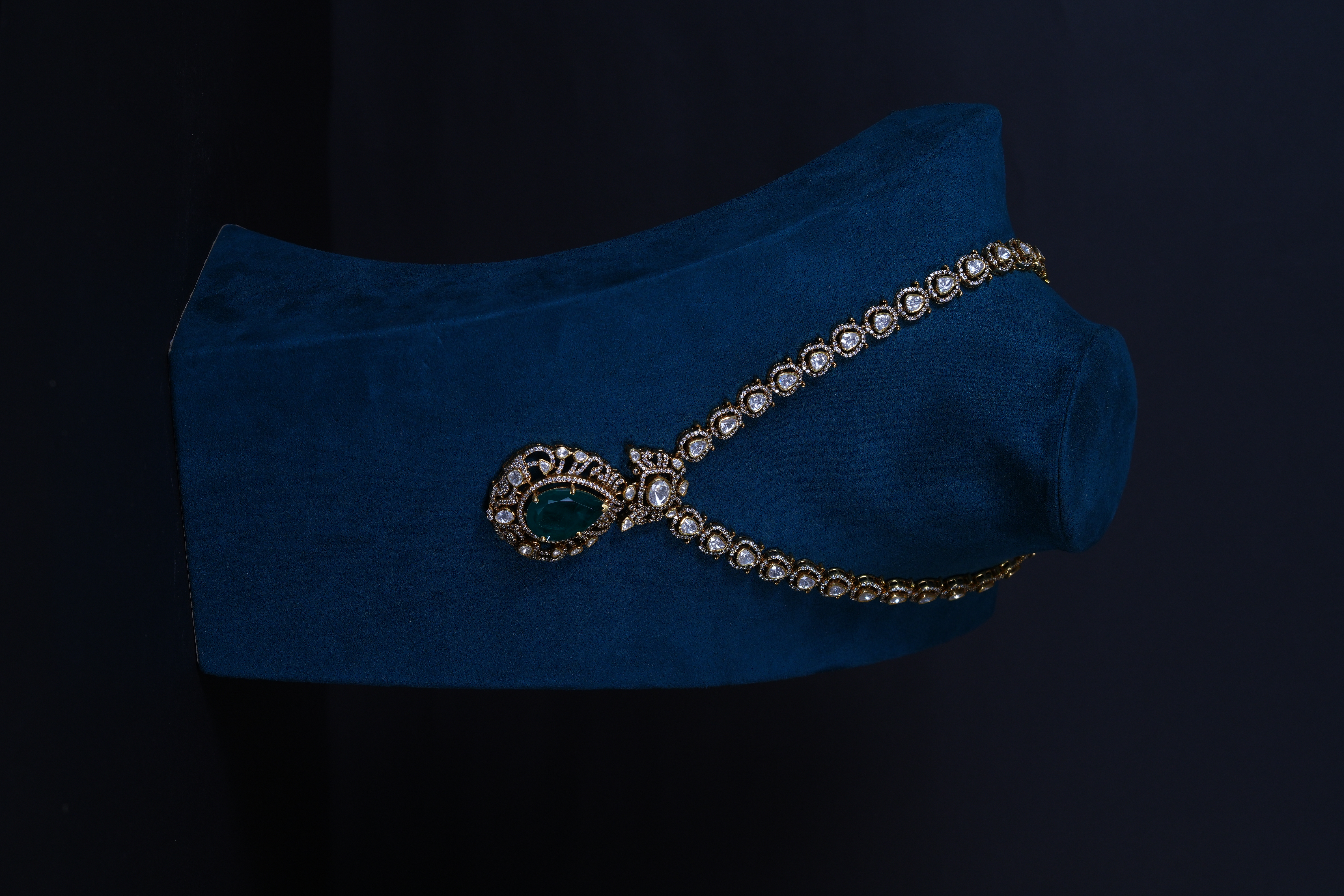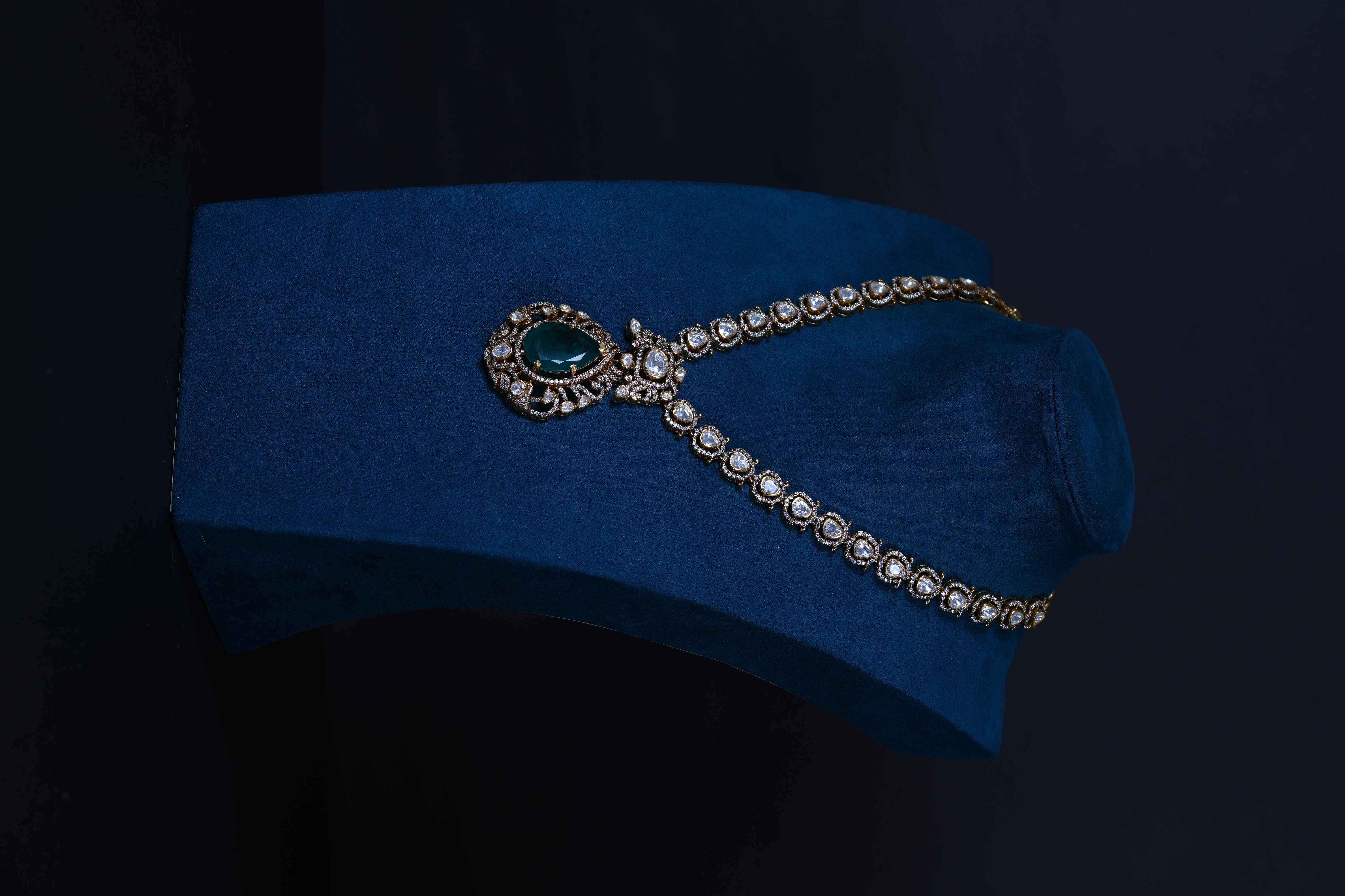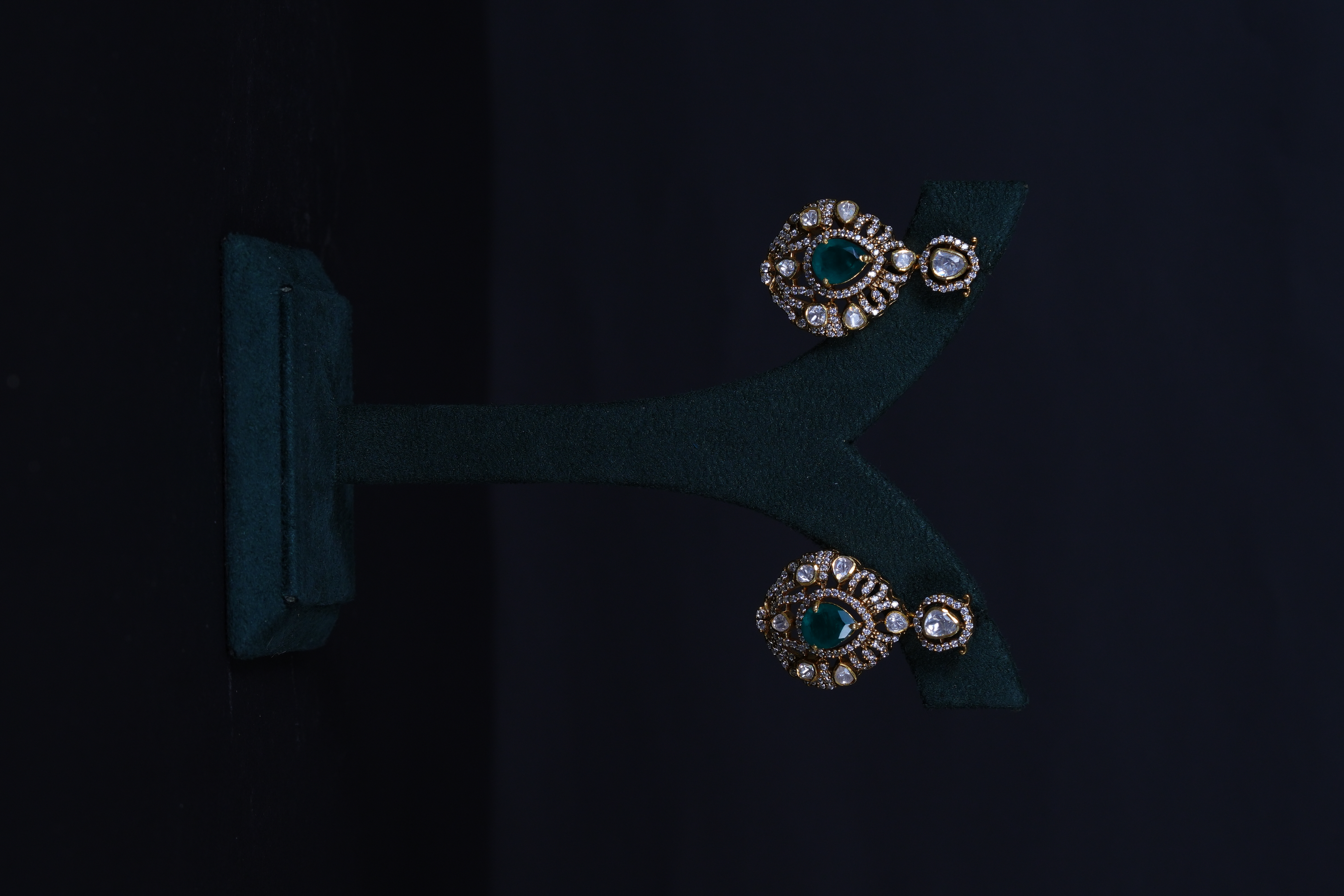 Emerald Polki necklace with matching earrings crafted in 92.5 sterling silver. A timeless blend of rich emerald tones and classic Polki detailing, perfect for weddings and festive occasions.
