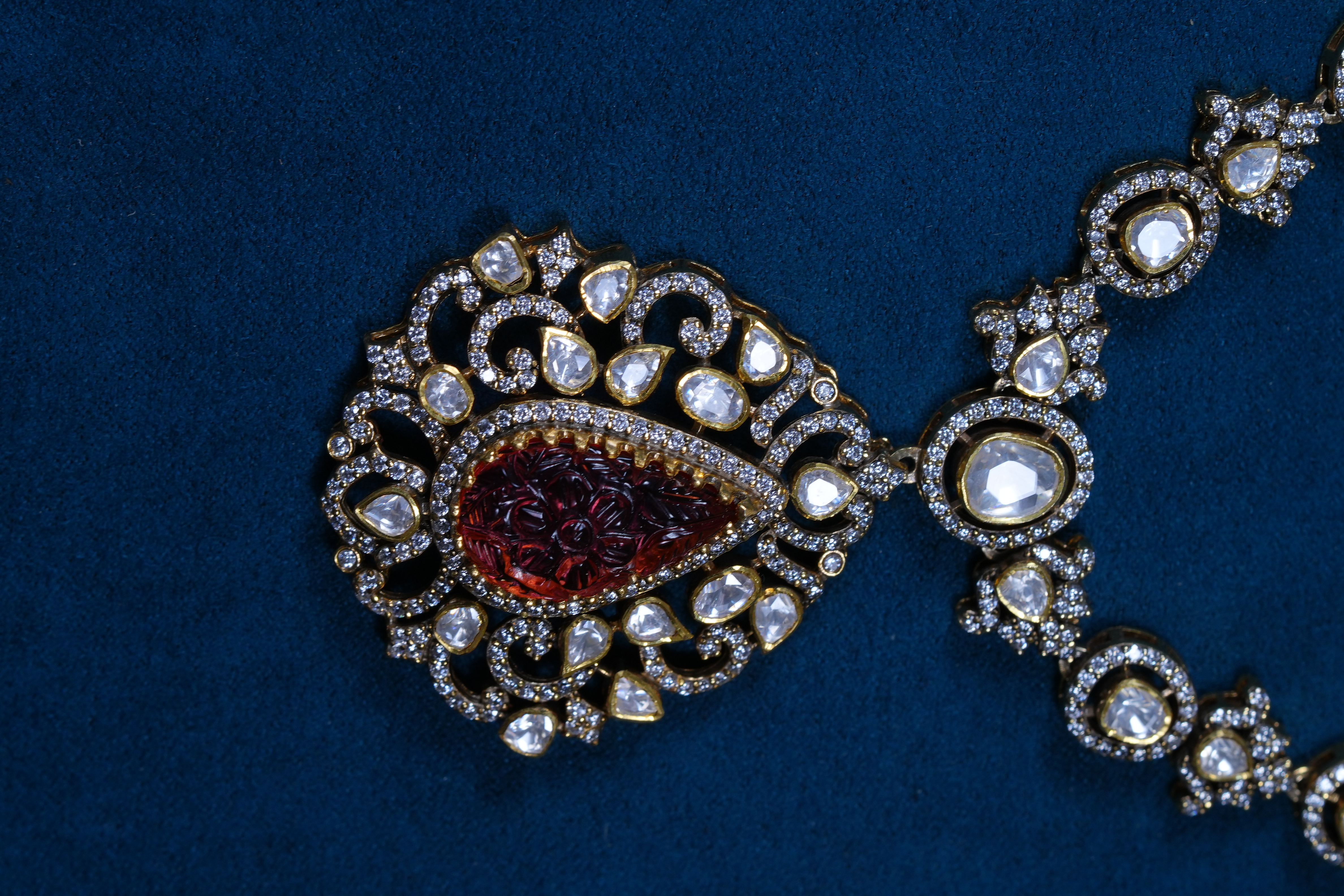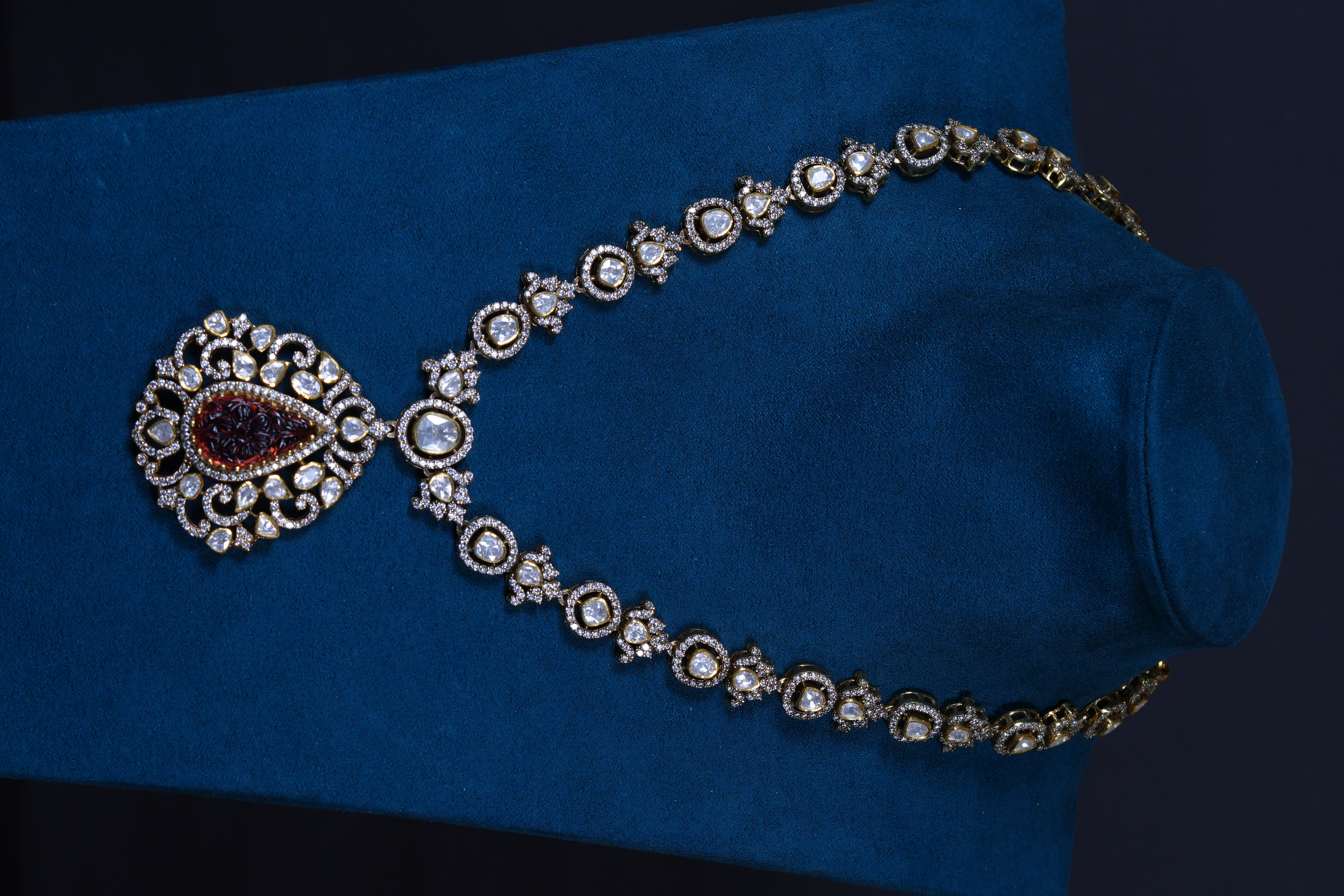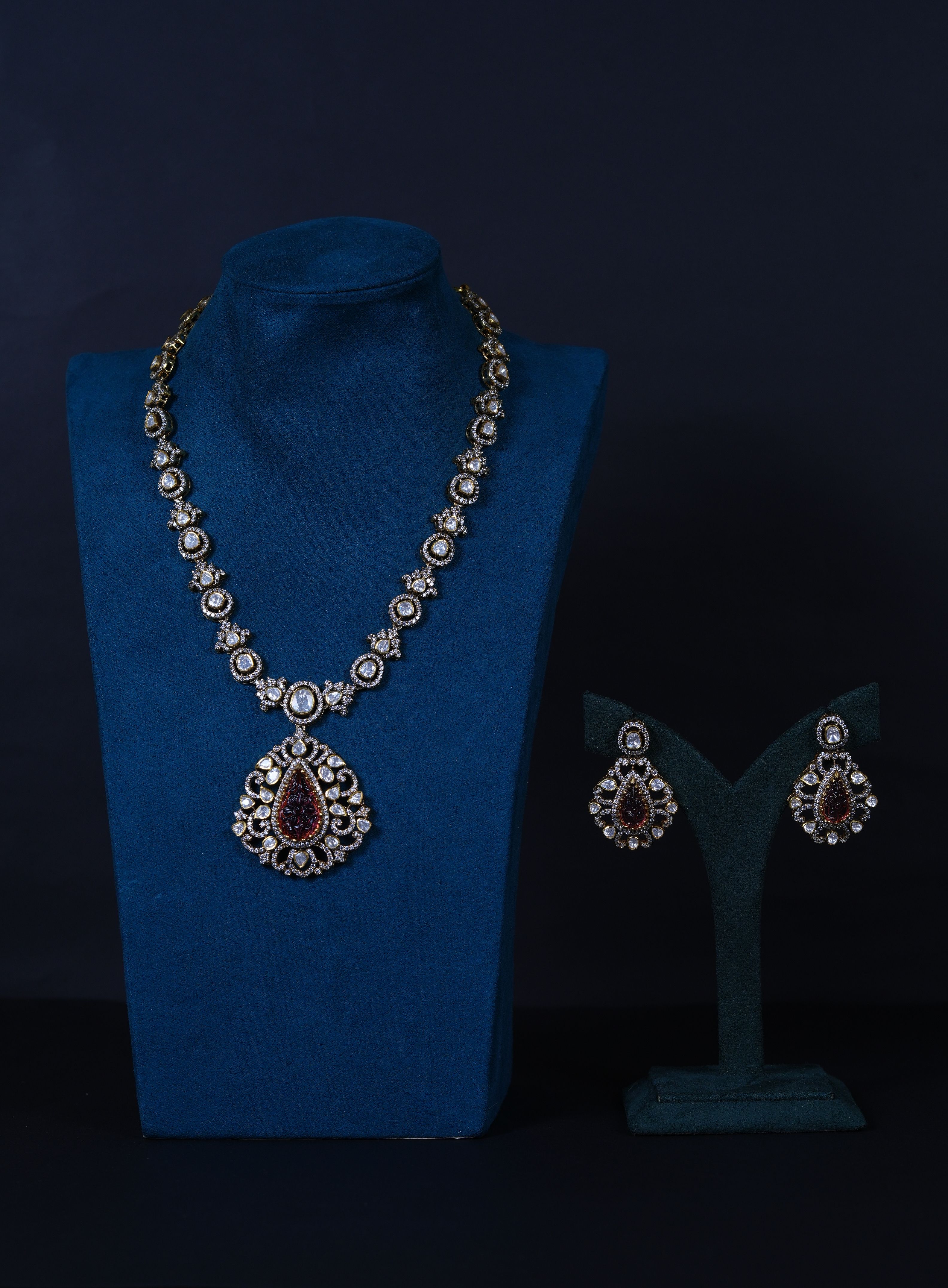 Real Polki and carved ruby necklace and earrings set crafted in 92.5 sterling silver. A timeless heritage-inspired design perfect for bridal and grand festive occasions.