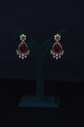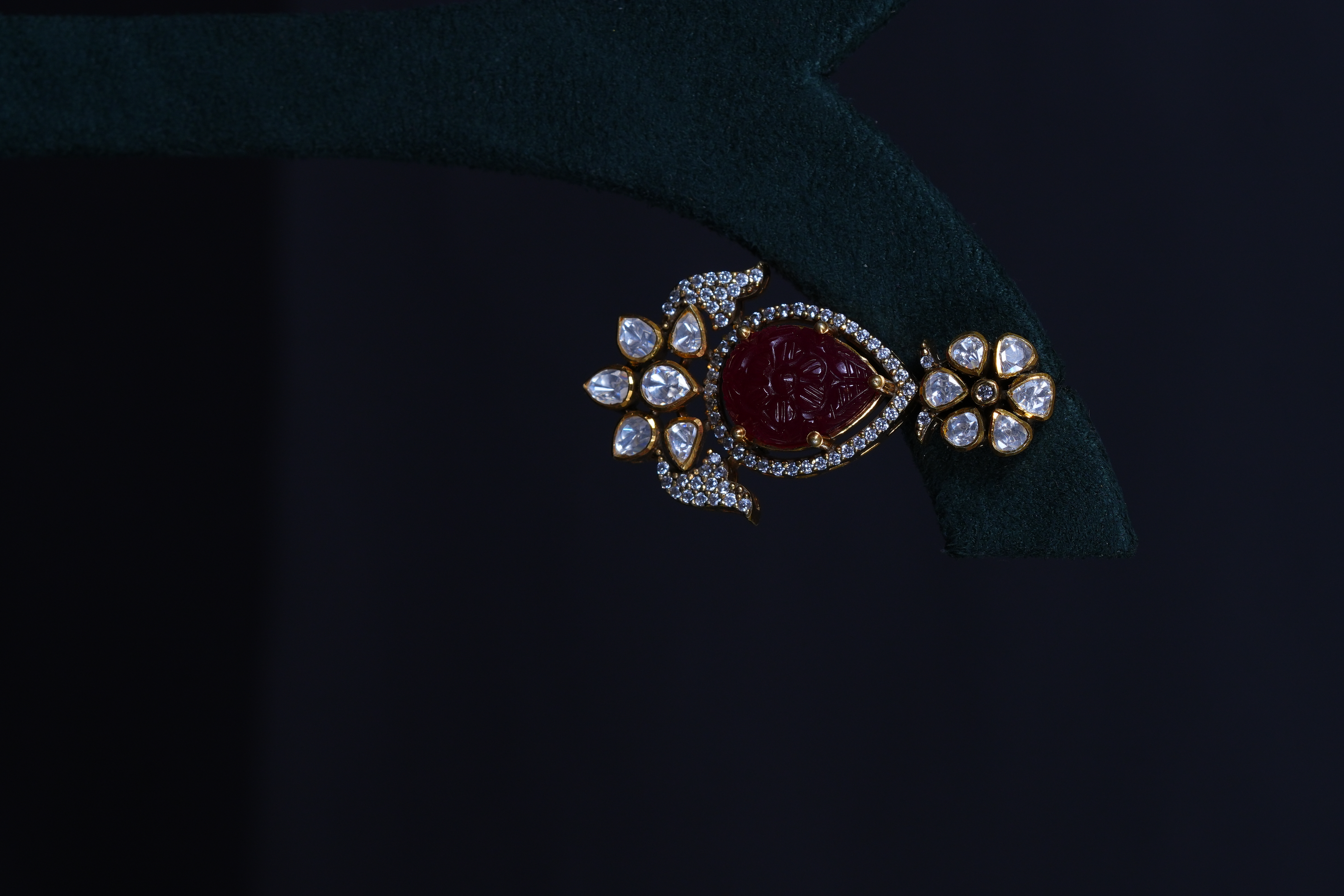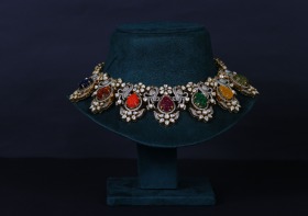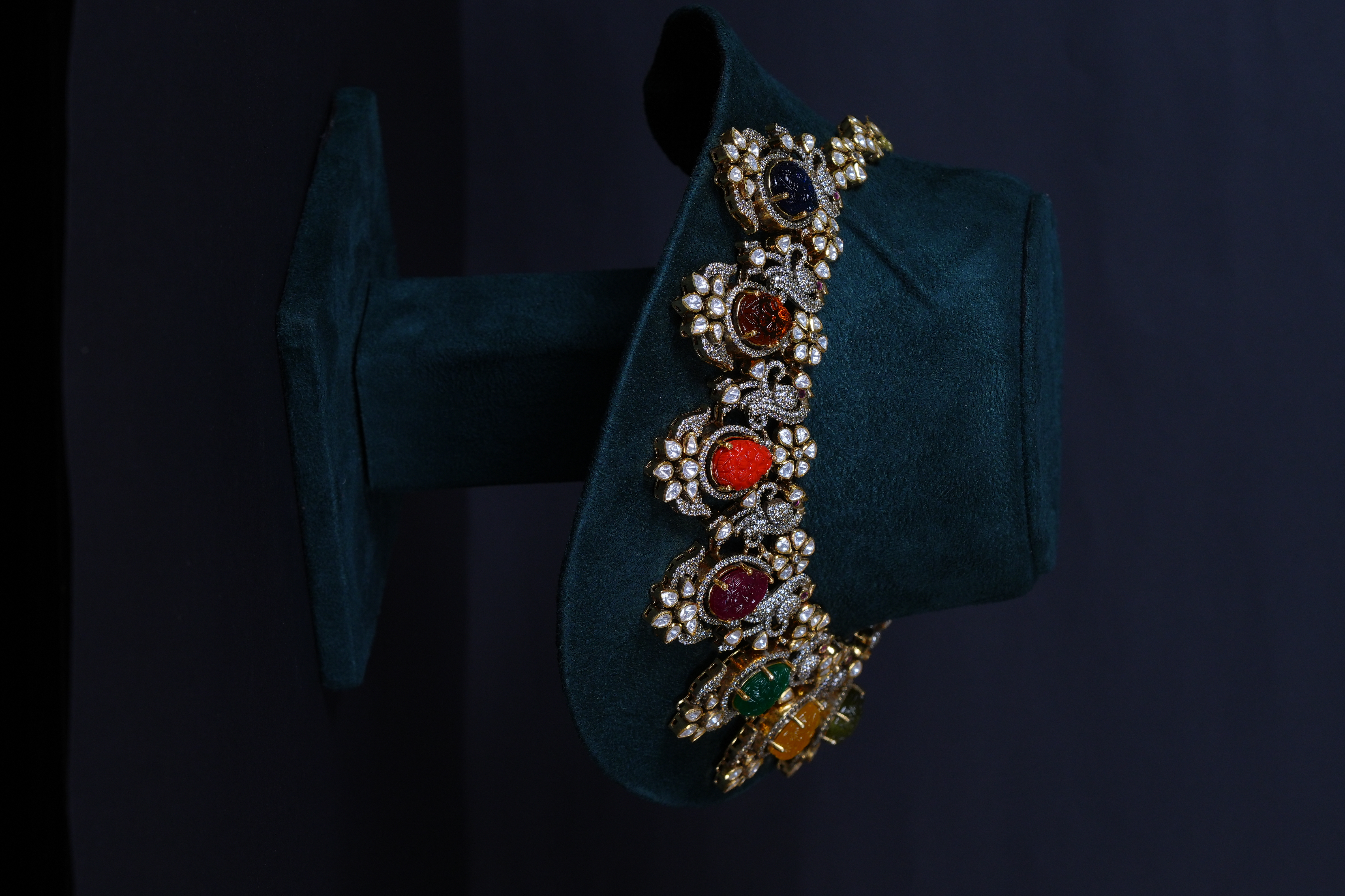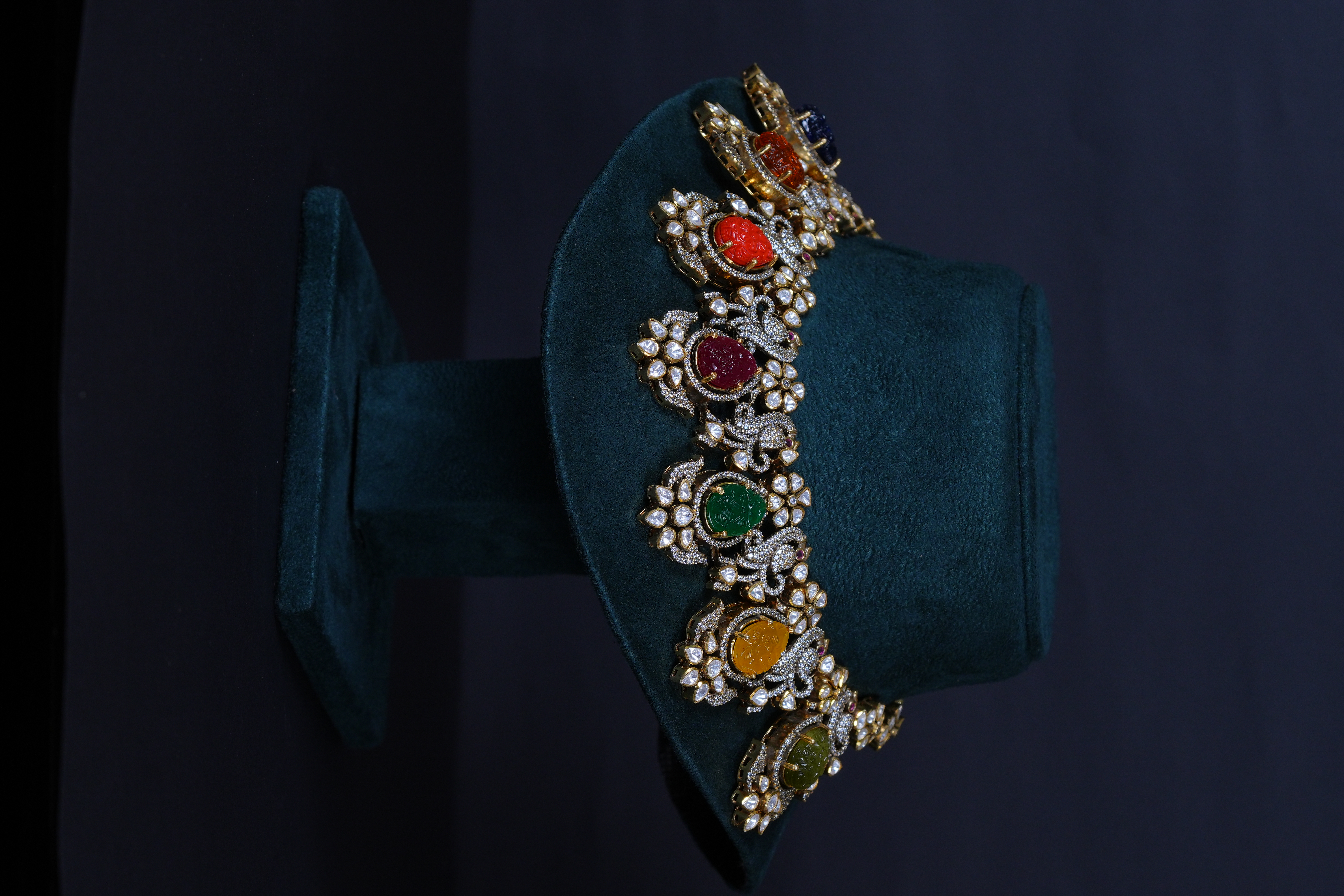 Royal Carved Navaratna Polki necklace and earrings set crafted in 92.5 sterling silver, enhanced with sparkling moissanite accents. A vibrant and regal statement piece perfect for weddings and festive occasions.