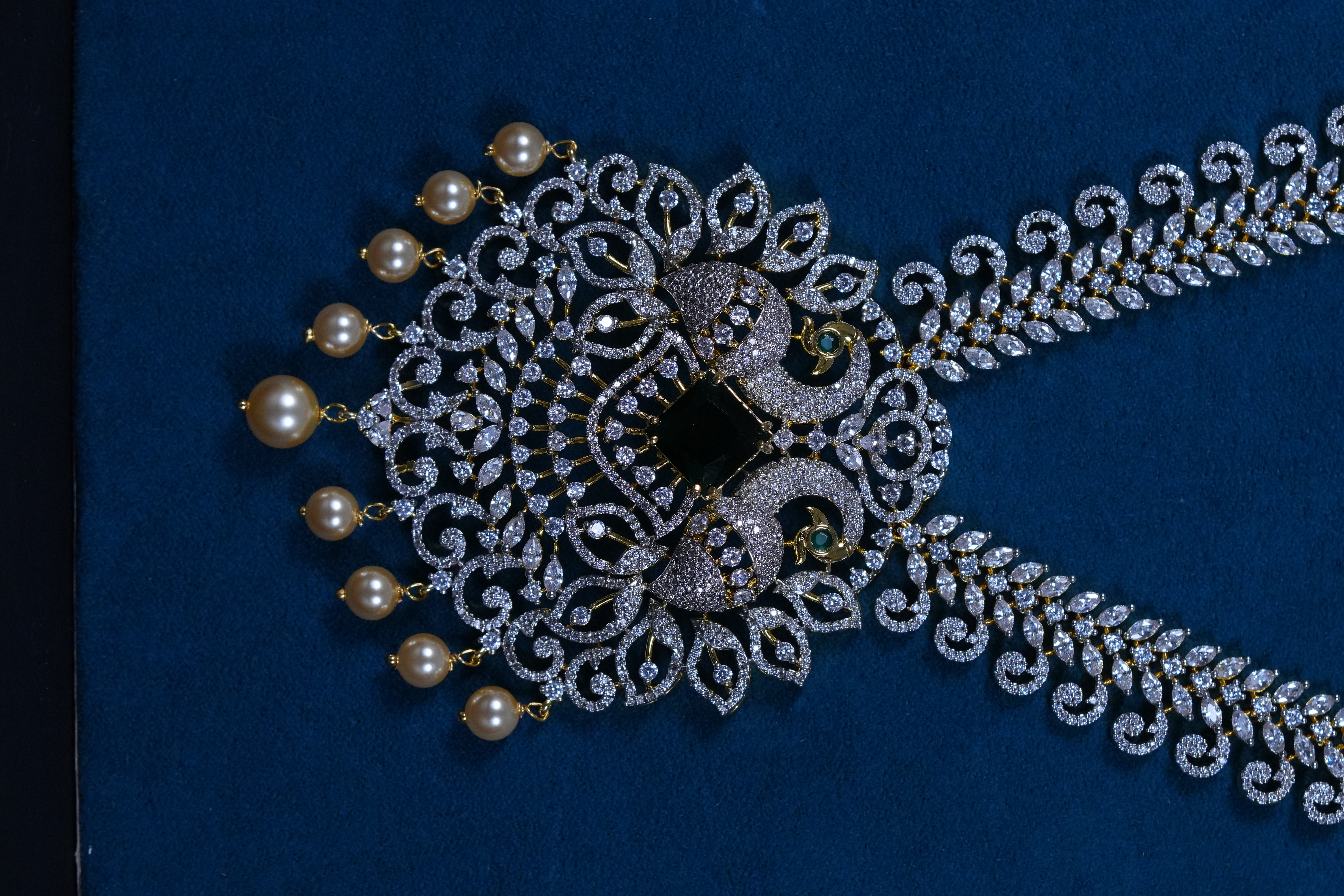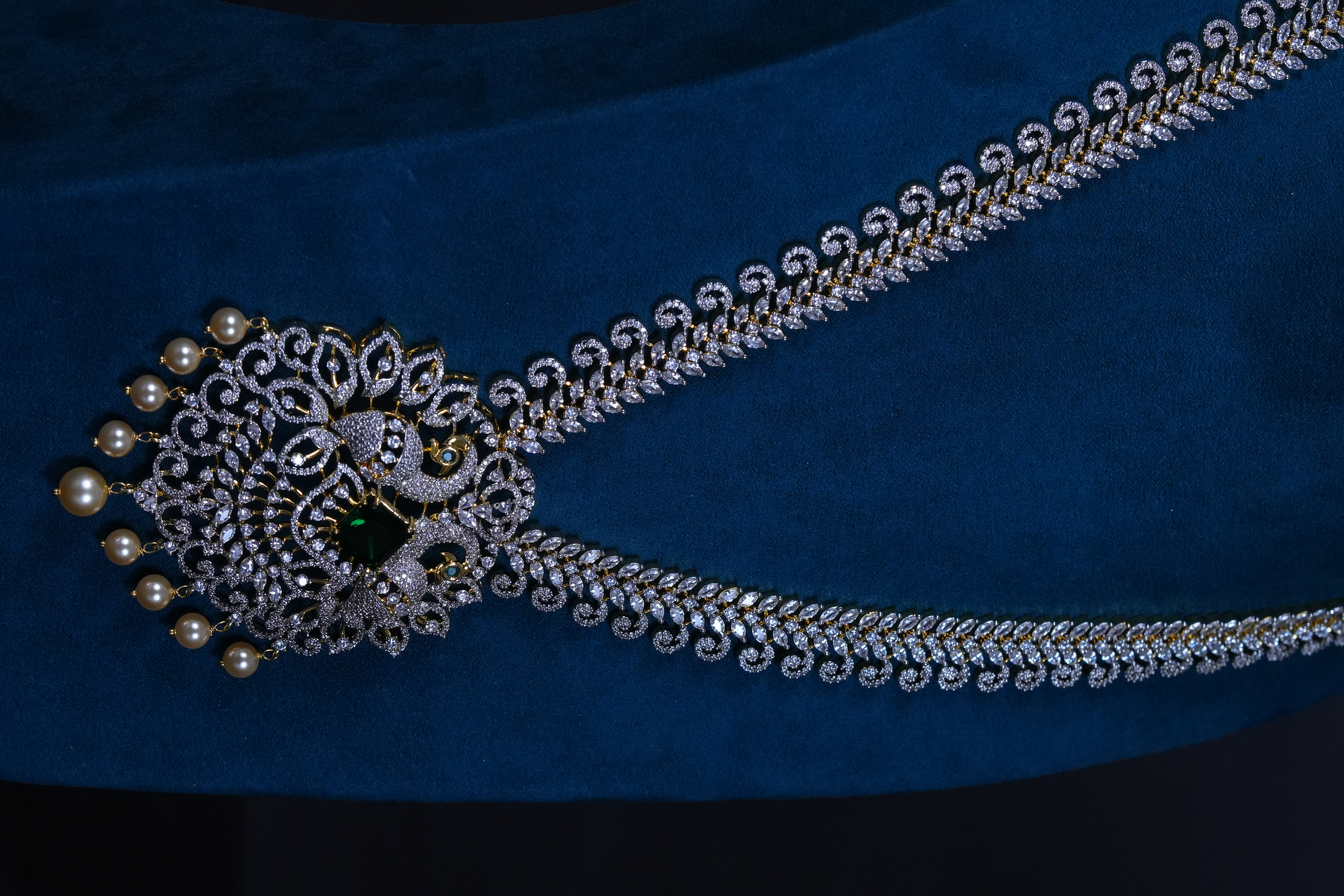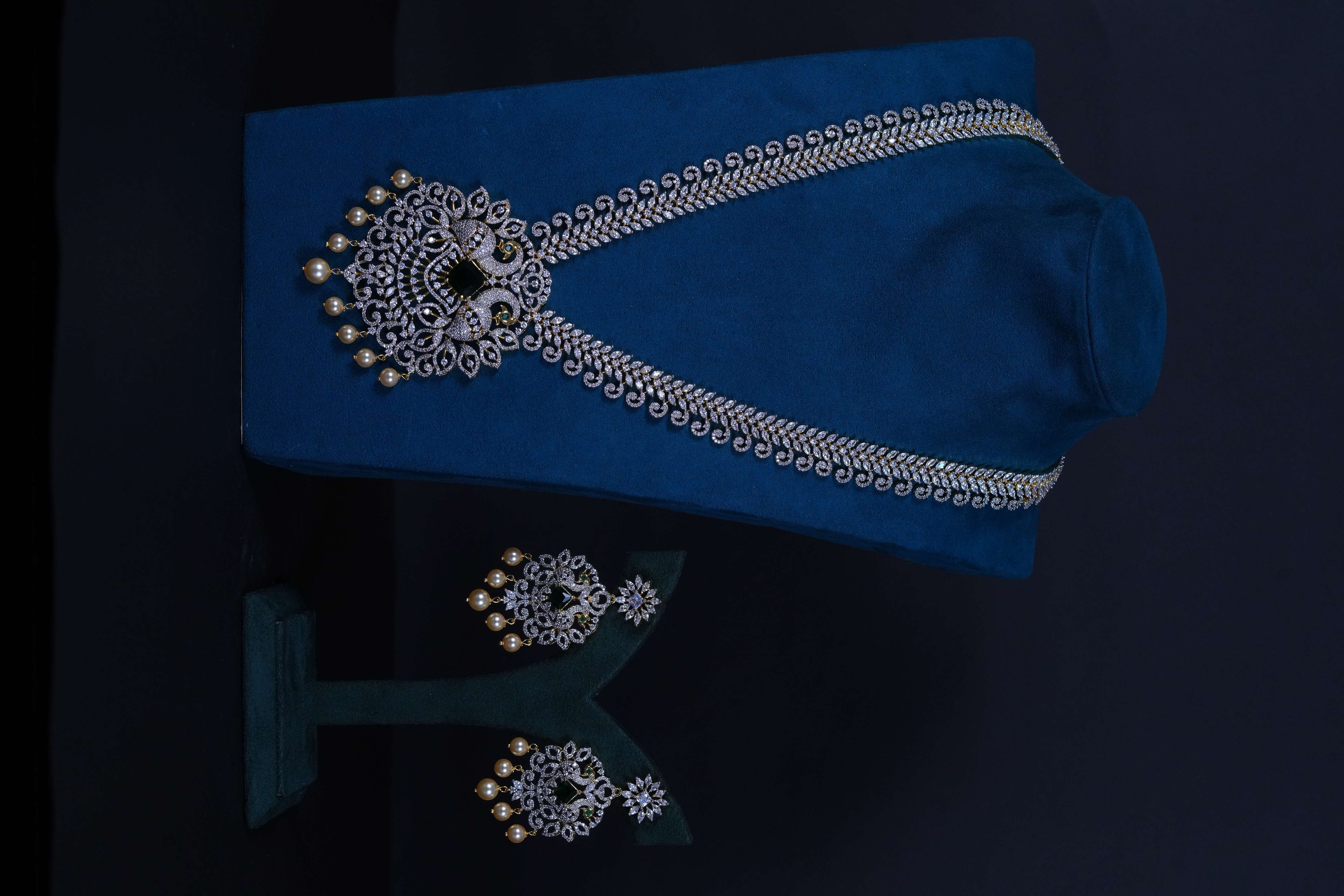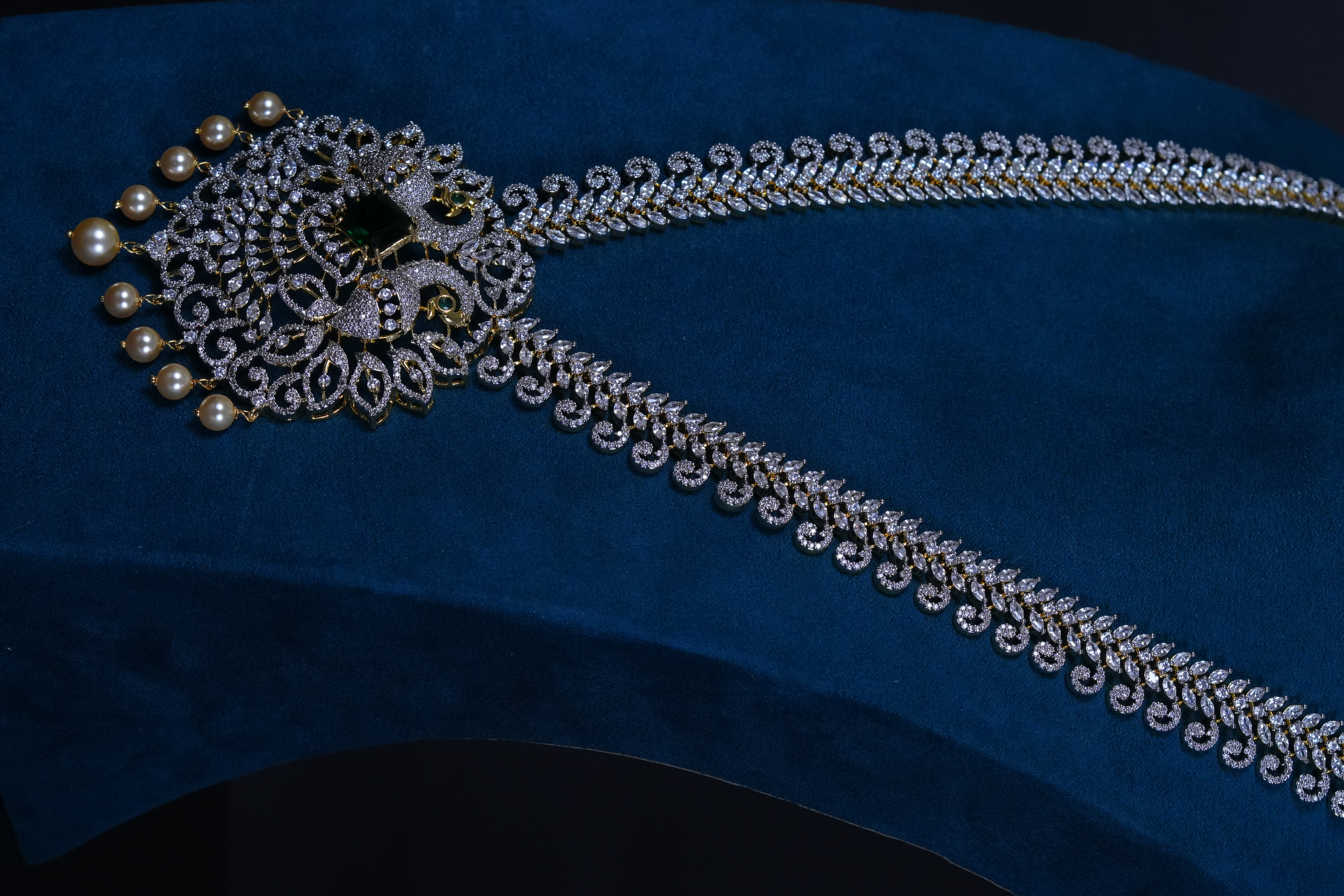 Royal Peacock American Diamond long haram crafted in 92.5 sterling silver. A grand statement piece designed for bridal elegance and festive occasions.