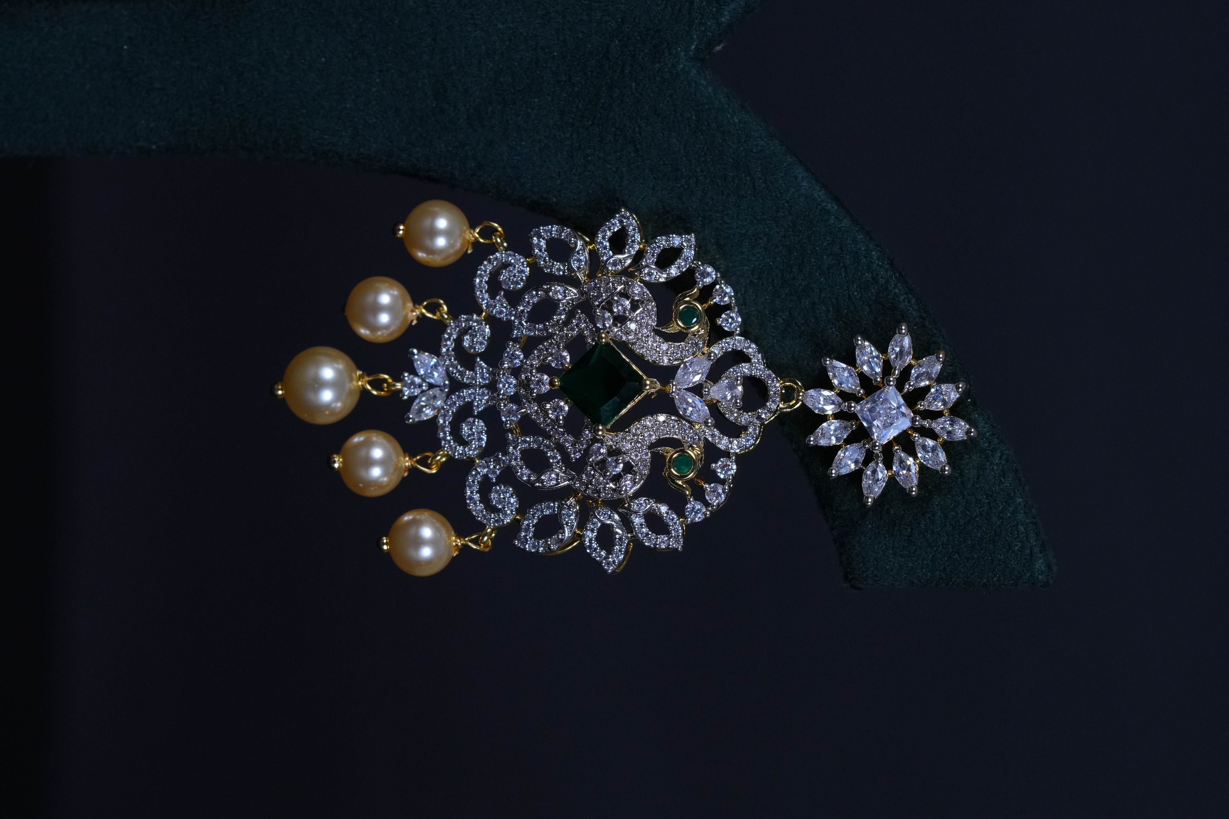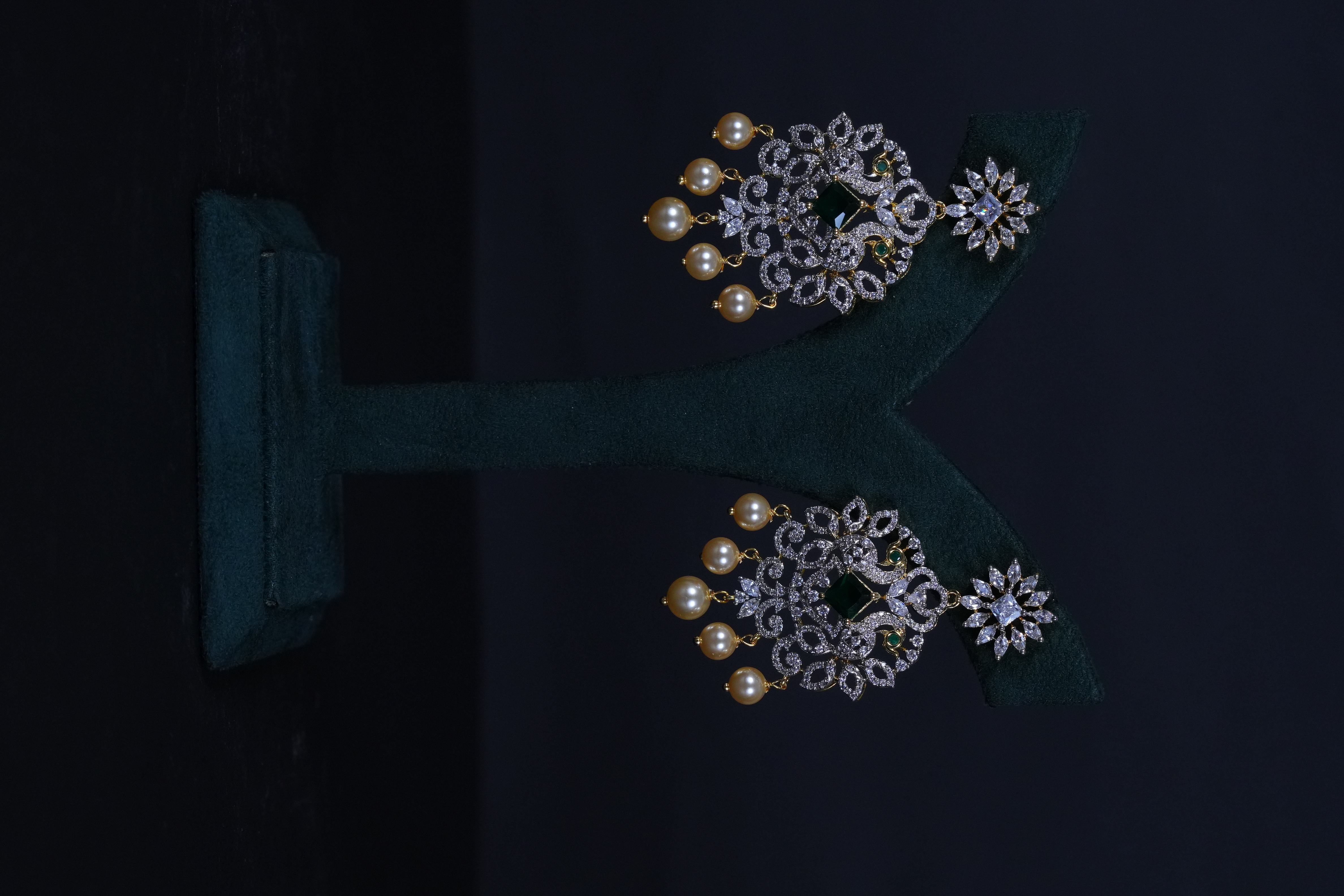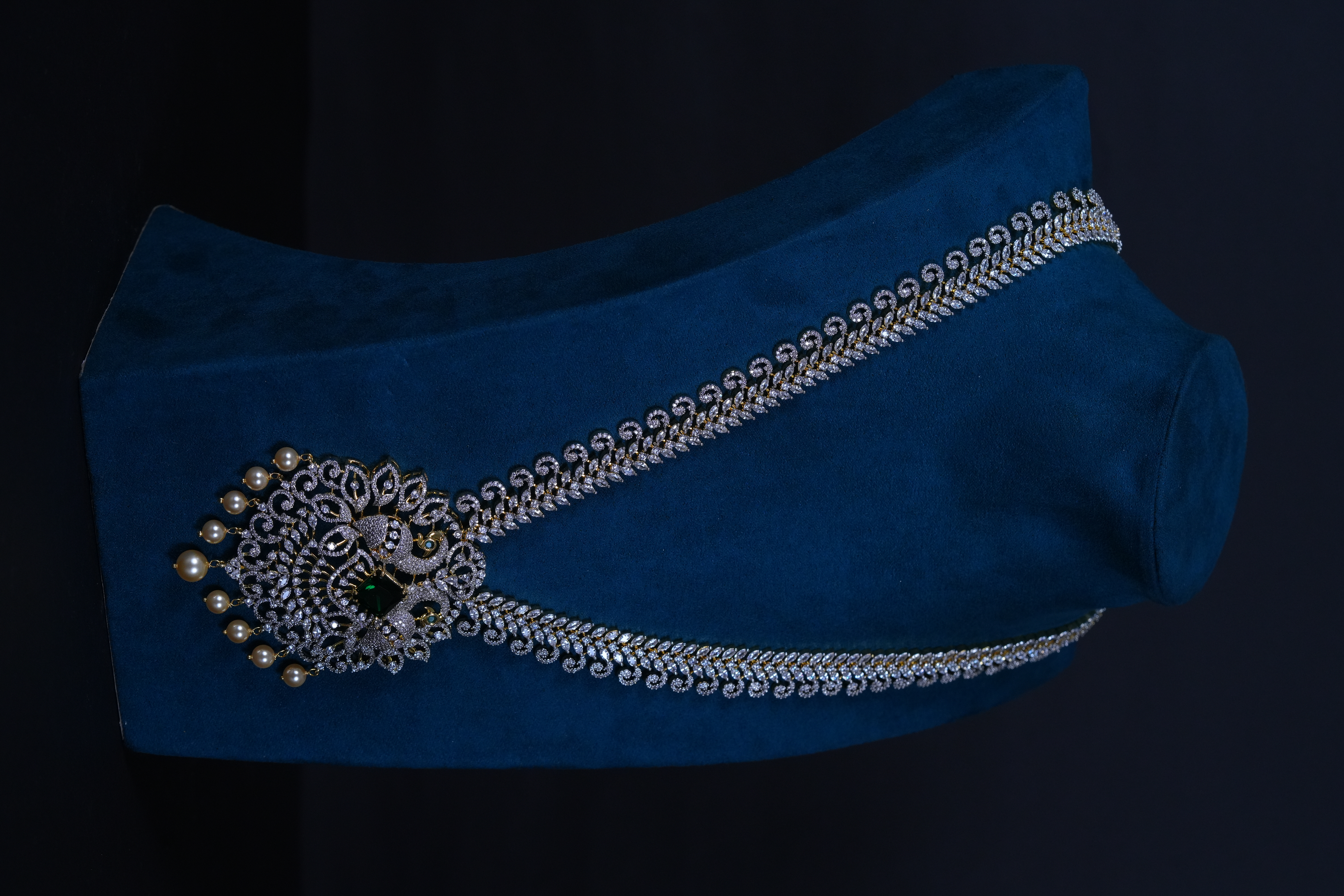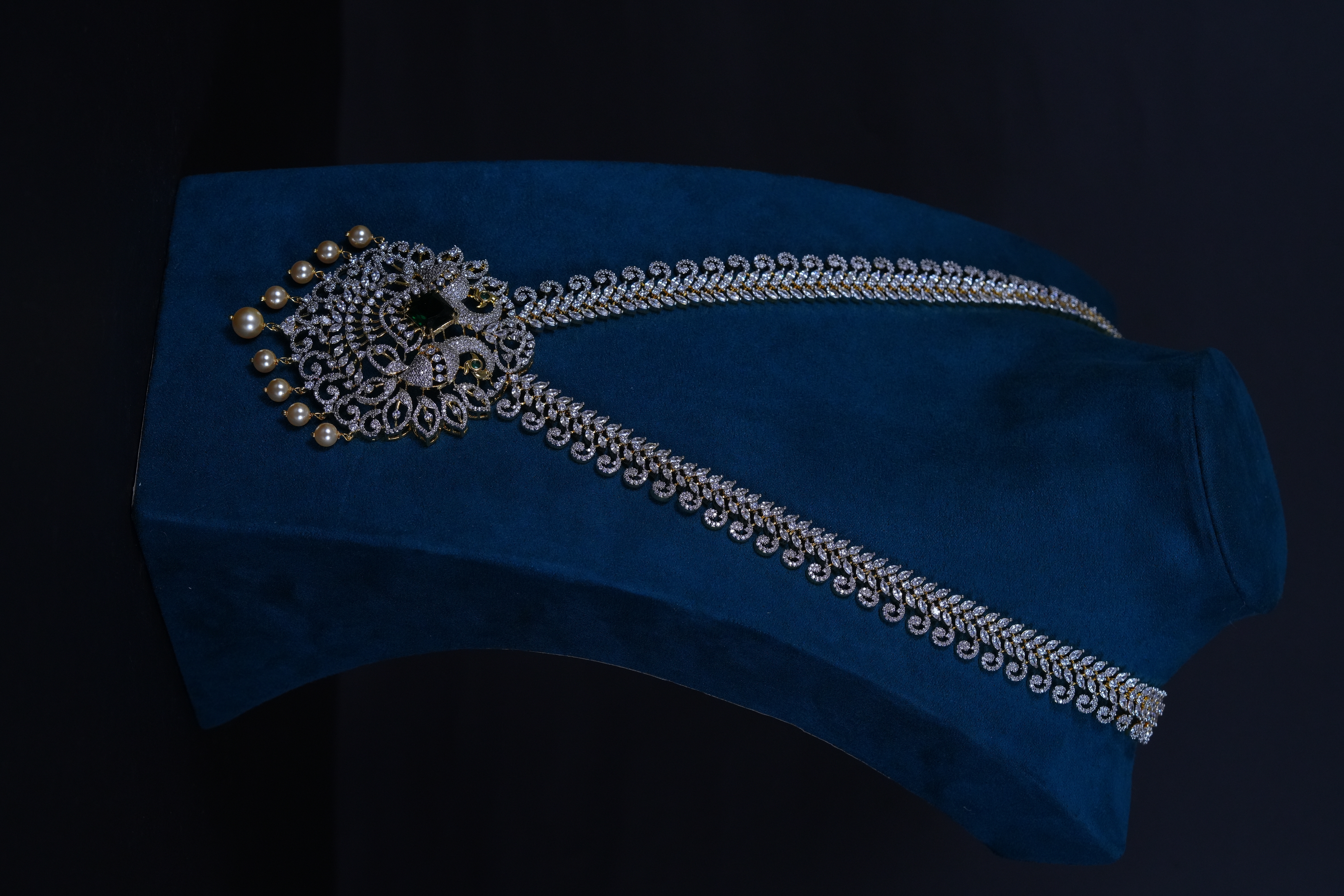 Royal Peacock American Diamond long haram crafted in 92.5 sterling silver. A grand statement piece designed for bridal elegance and festive occasions.
