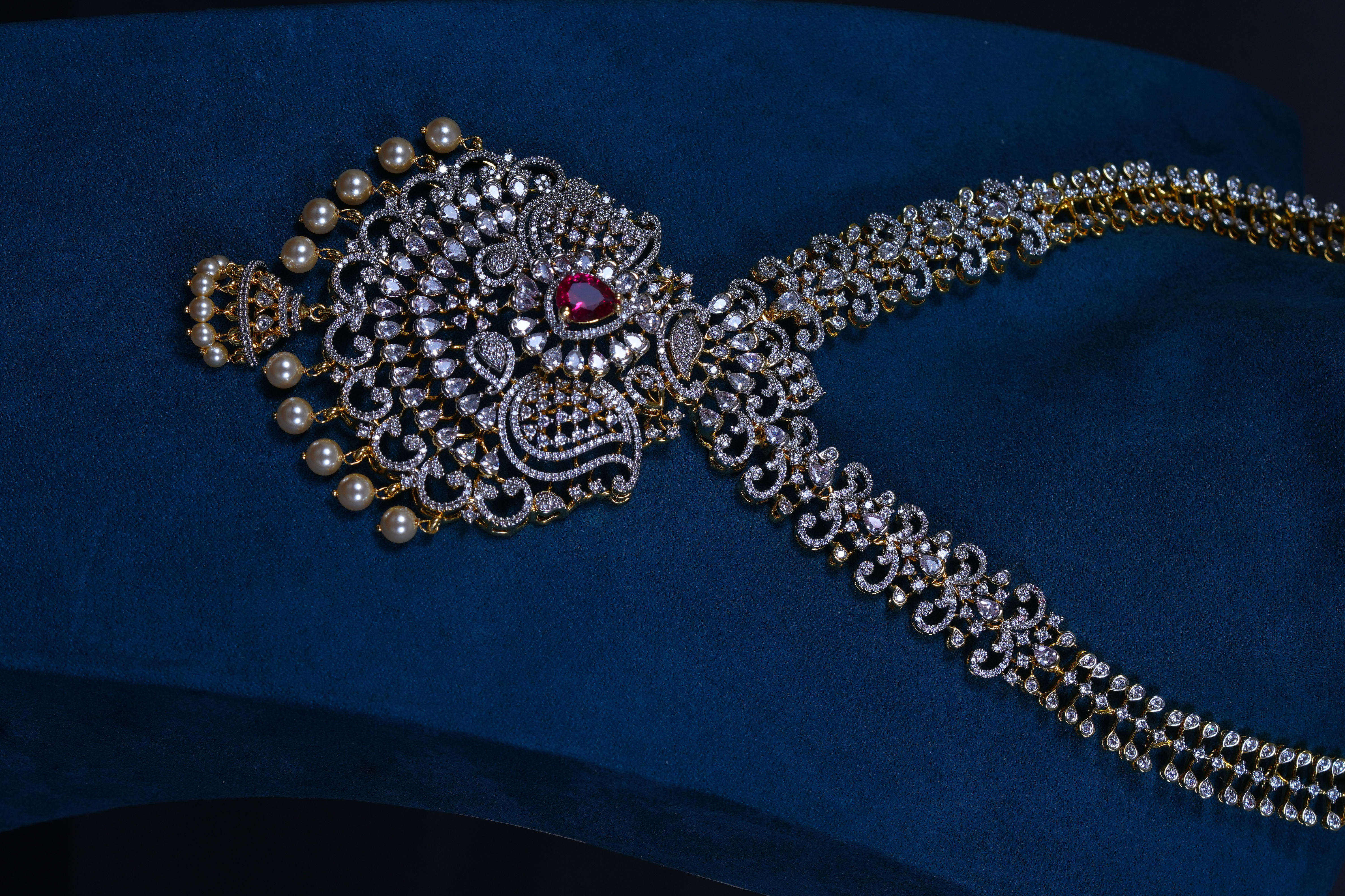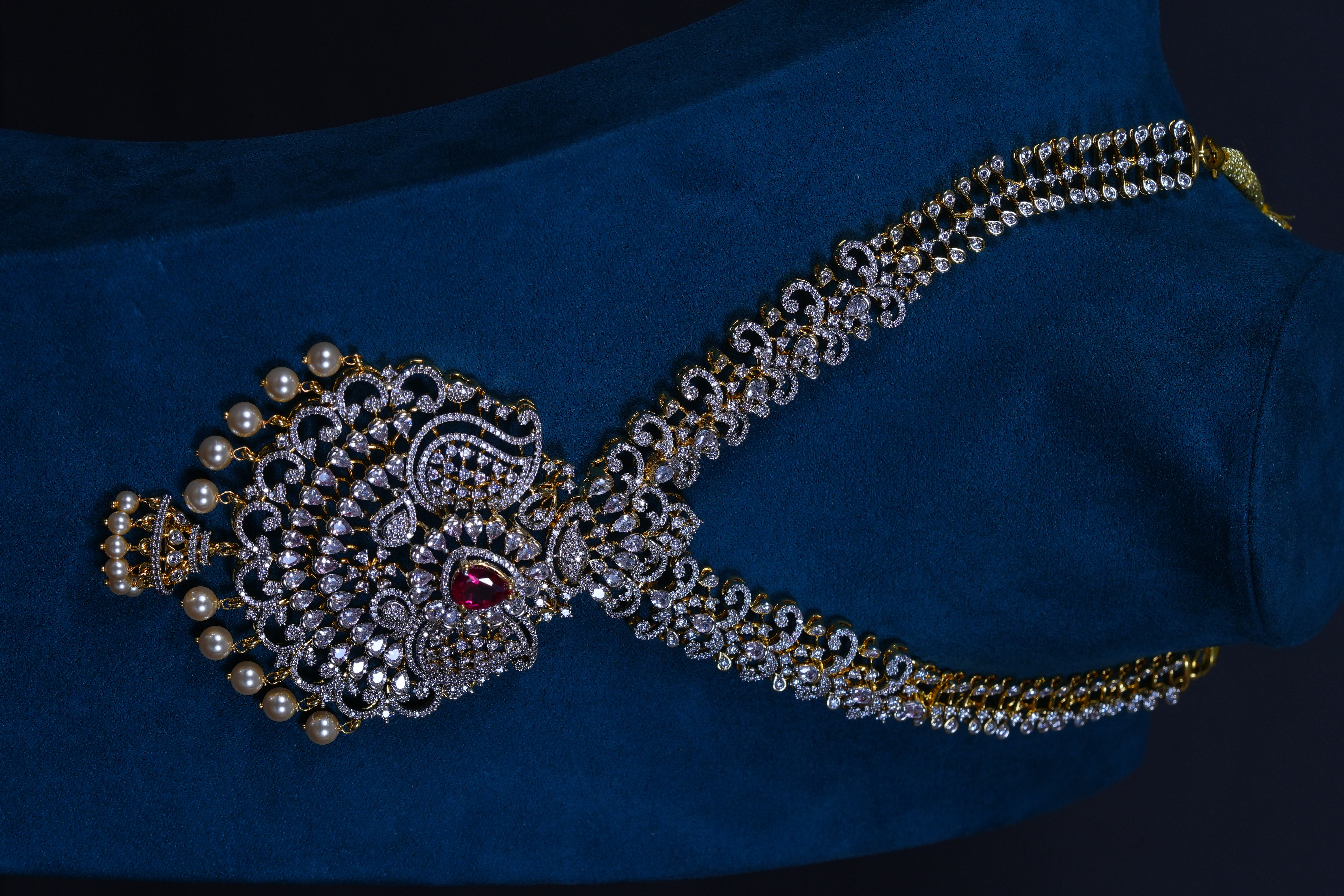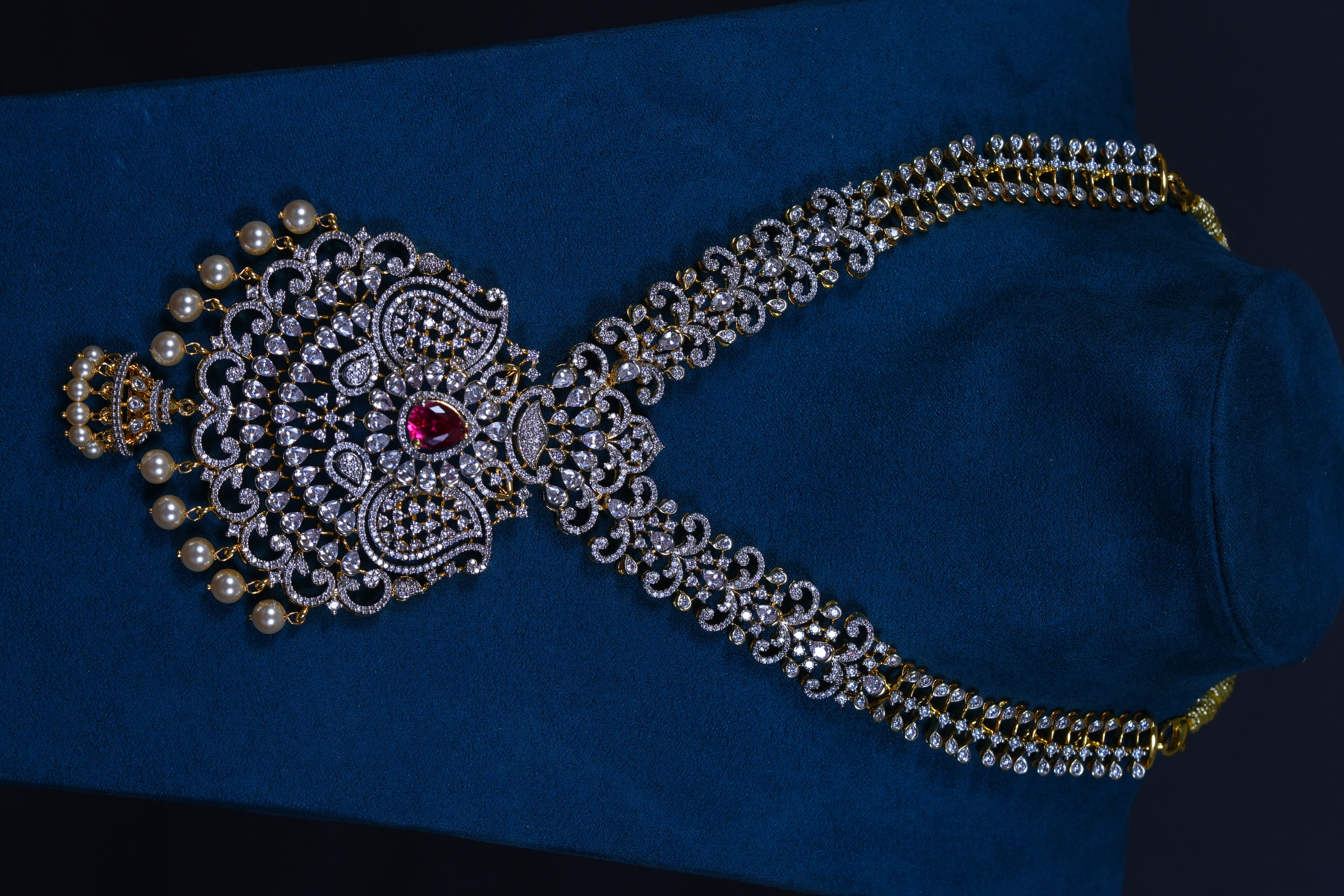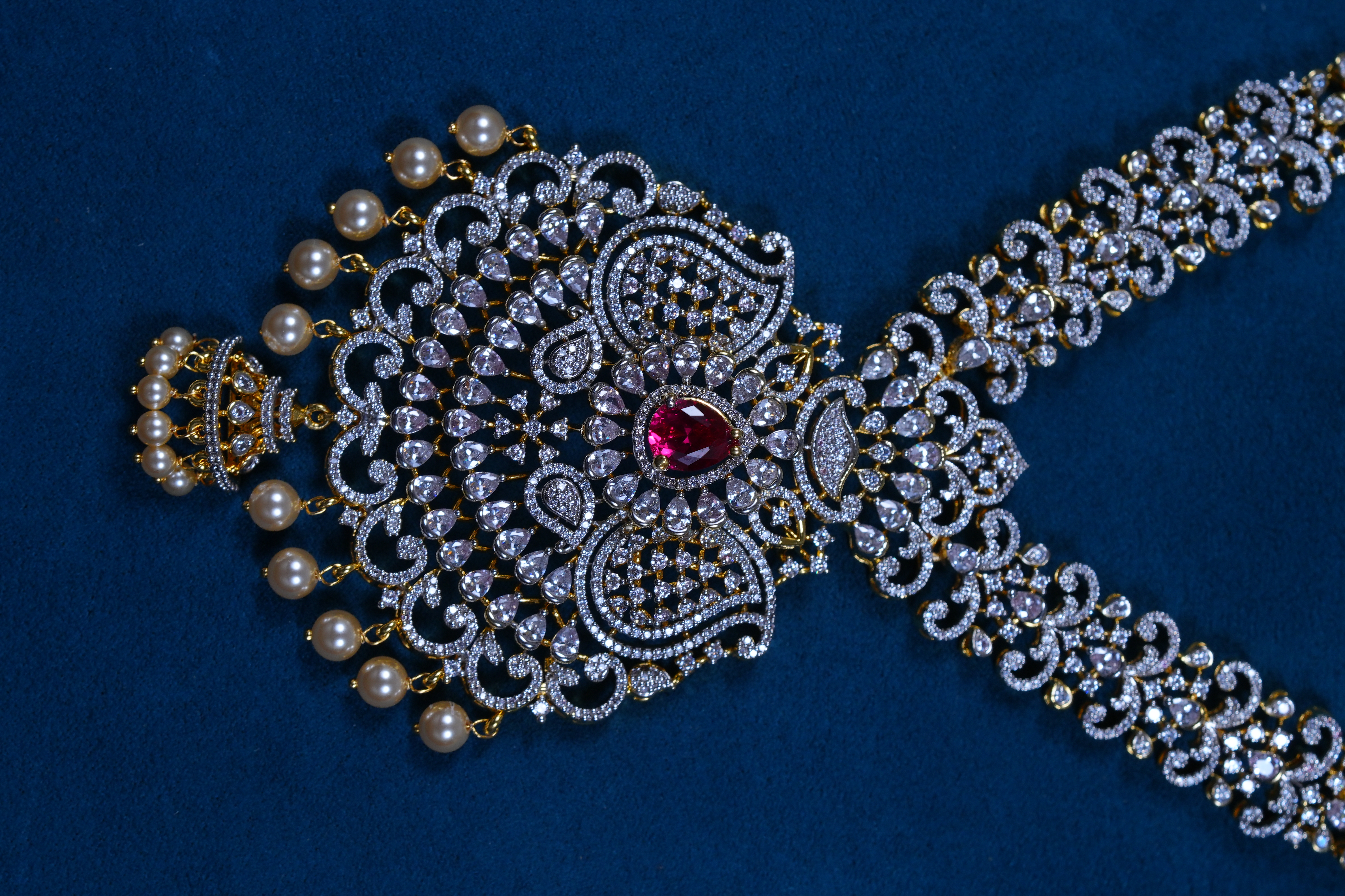 Royal Ruby AD stones long haram set crafted in 92.5 sterling silver. A grand bridal statement featuring radiant American Diamond sparkle with rich ruby accents.