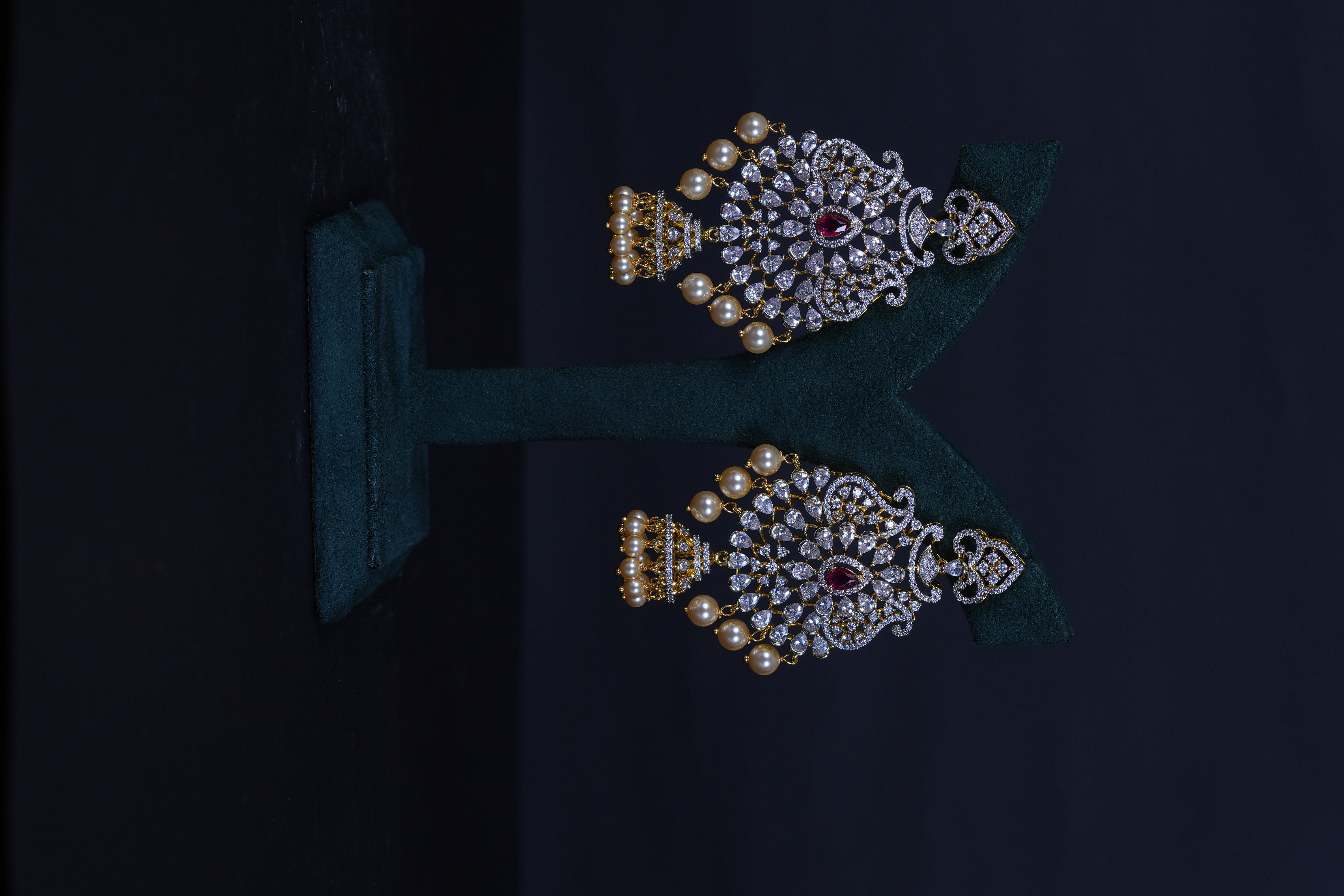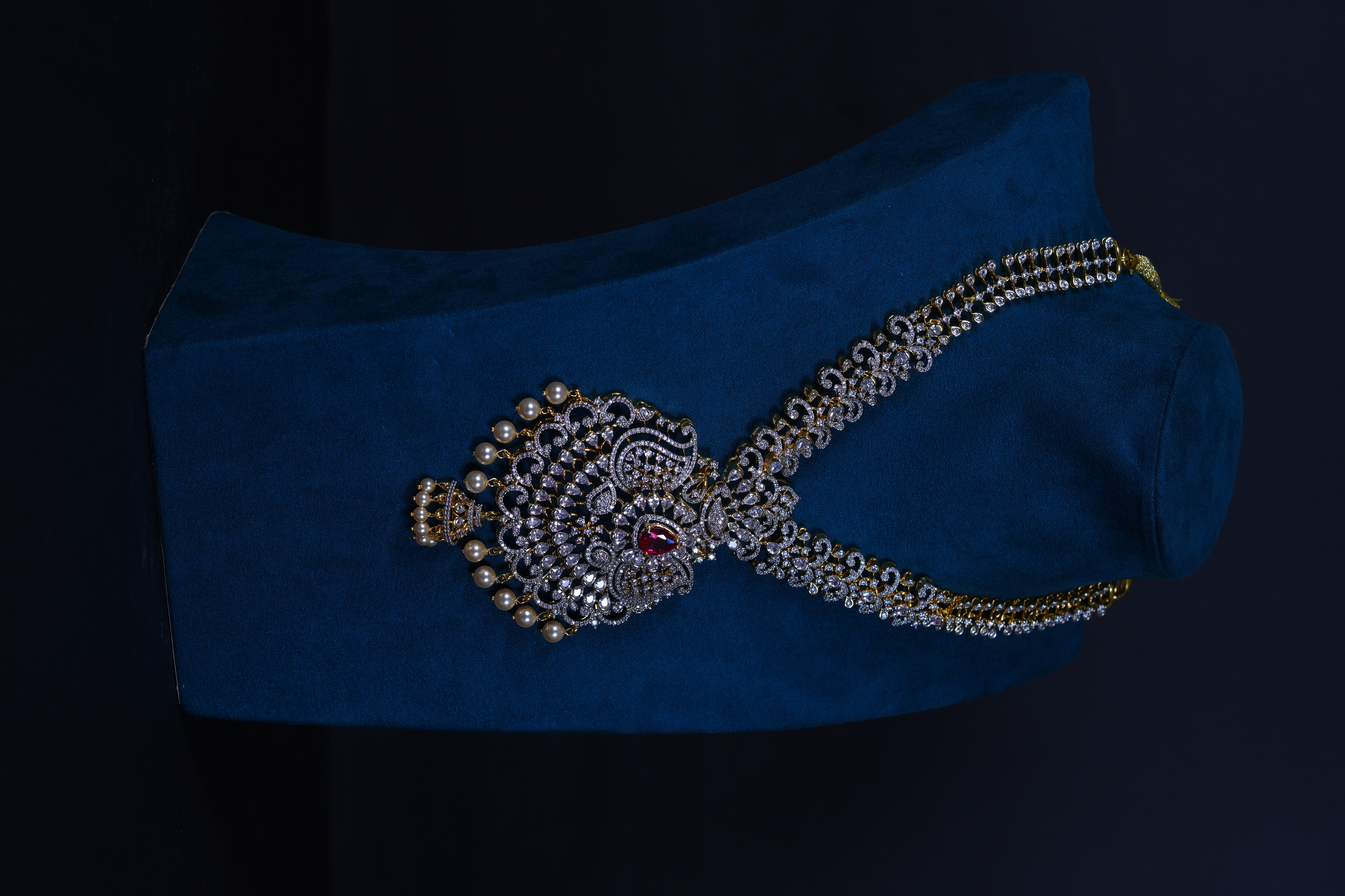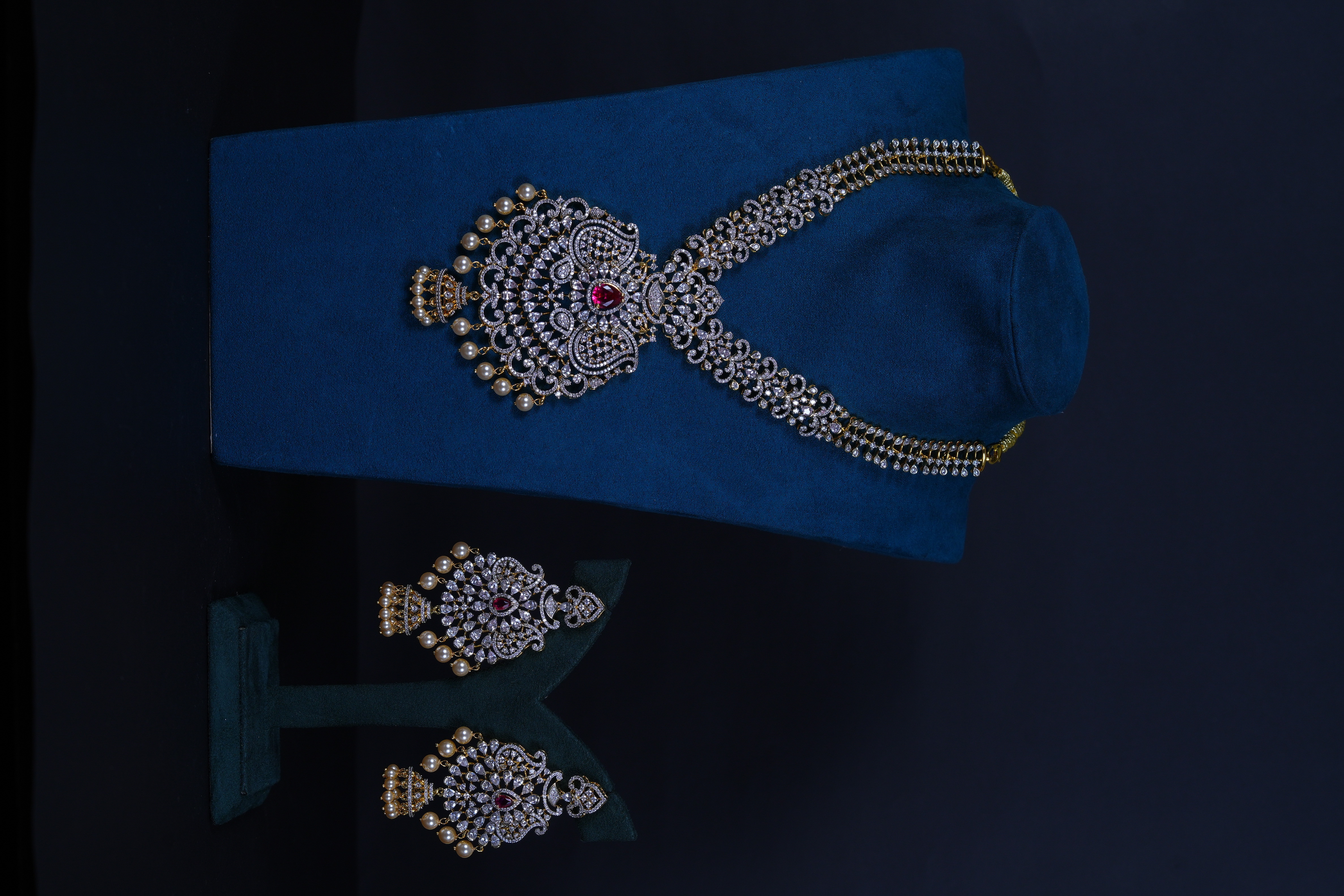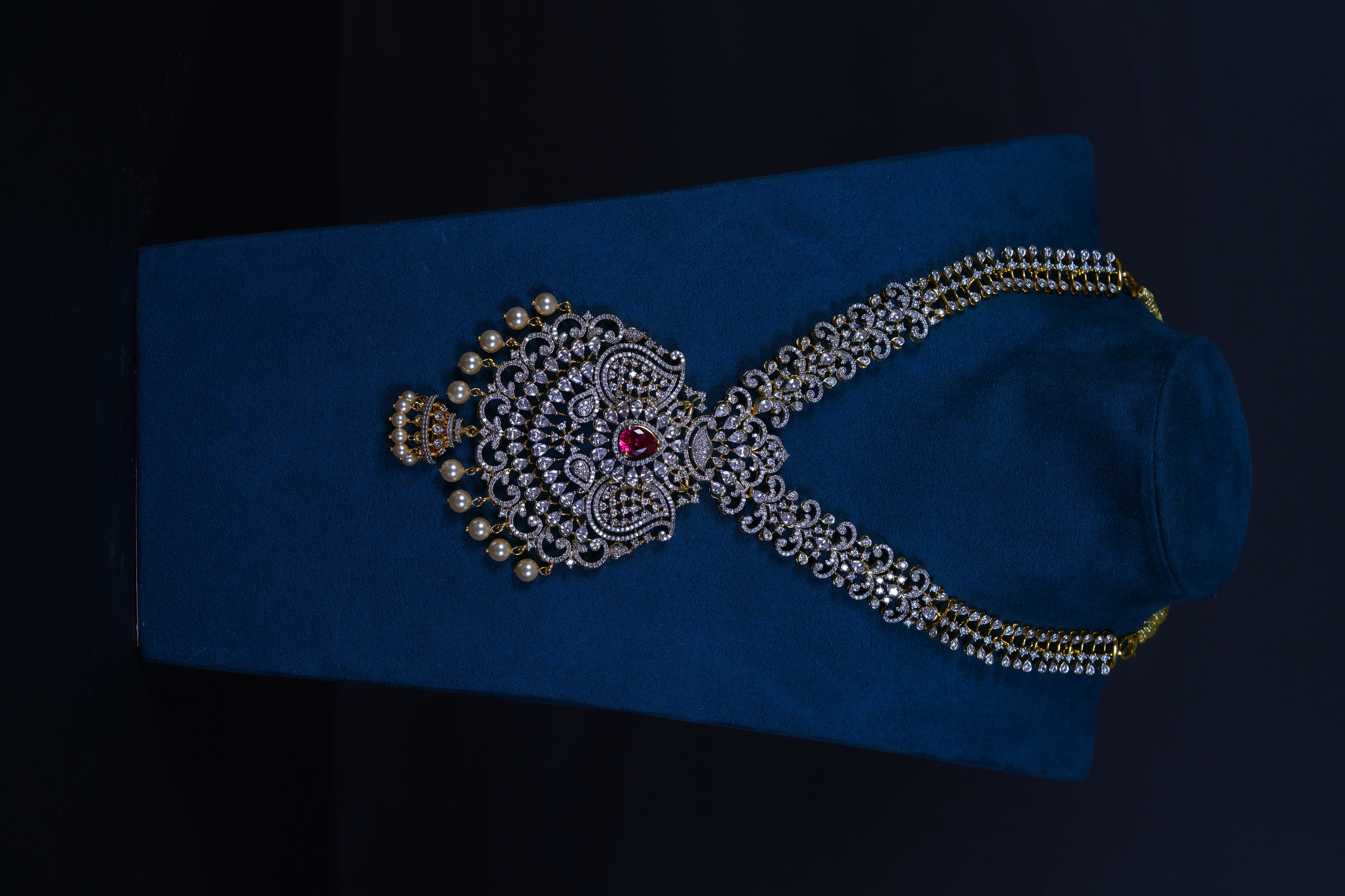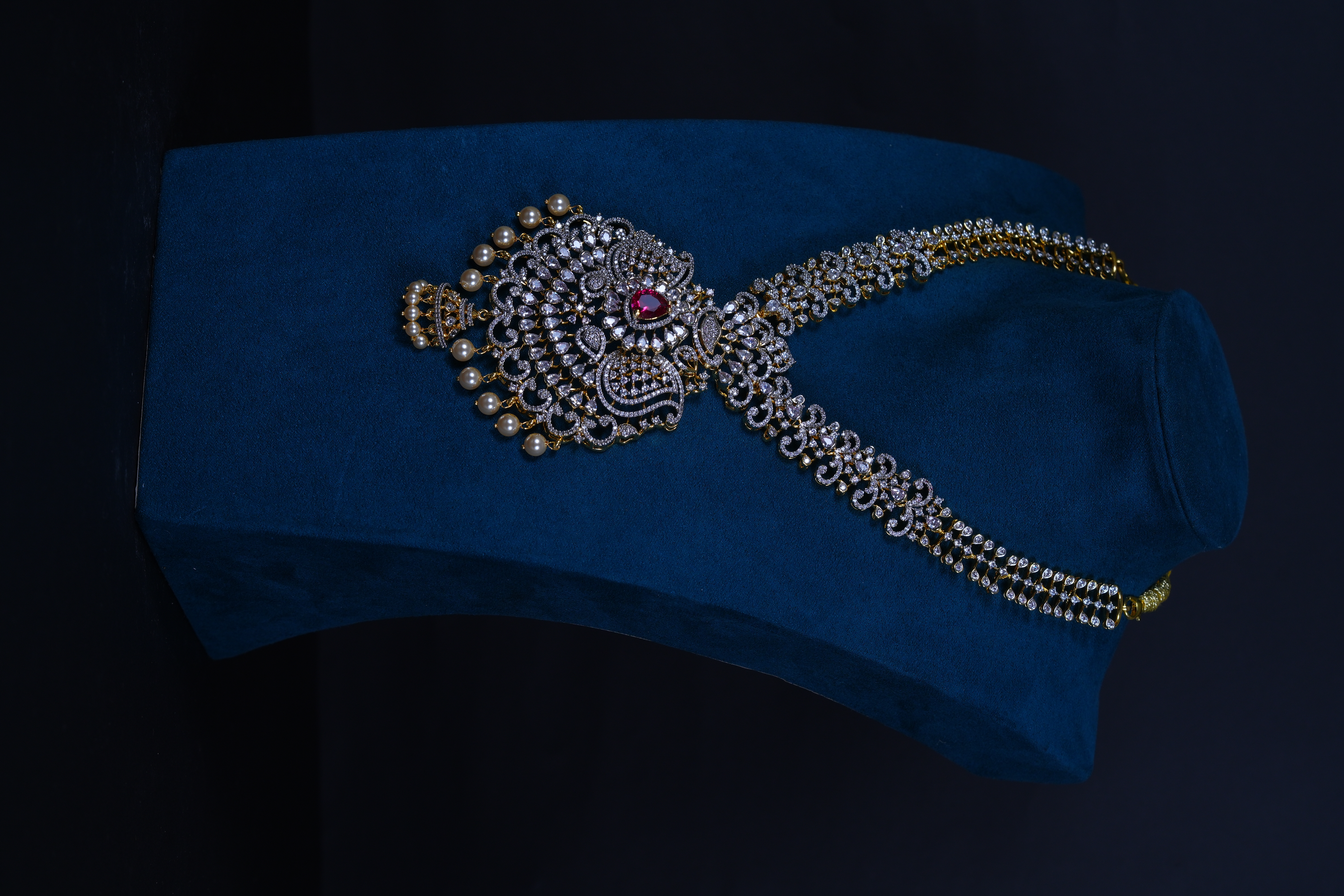 Royal Ruby AD stones long haram set crafted in 92.5 sterling silver. A grand bridal statement featuring radiant American Diamond sparkle with rich ruby accents.
