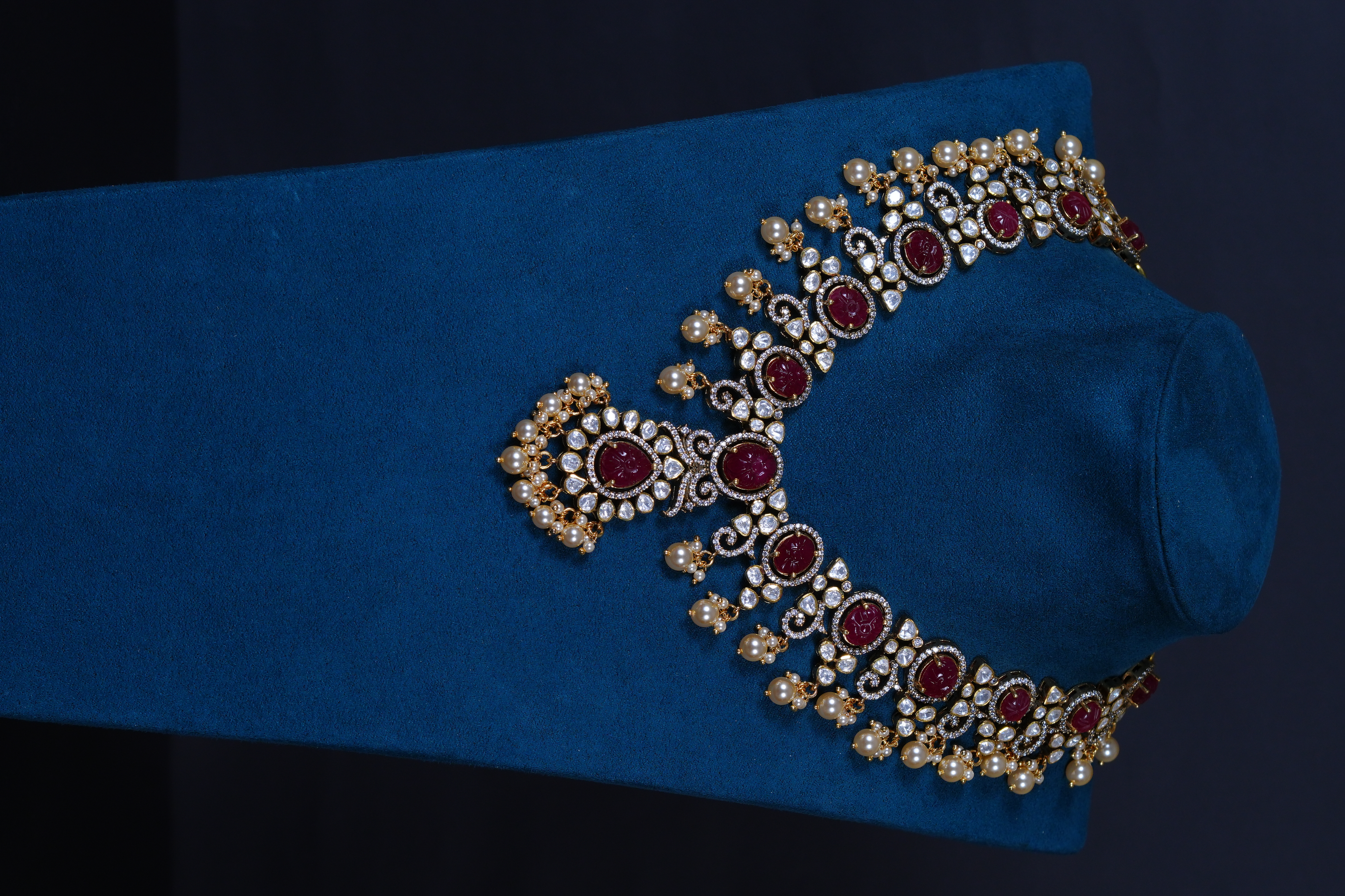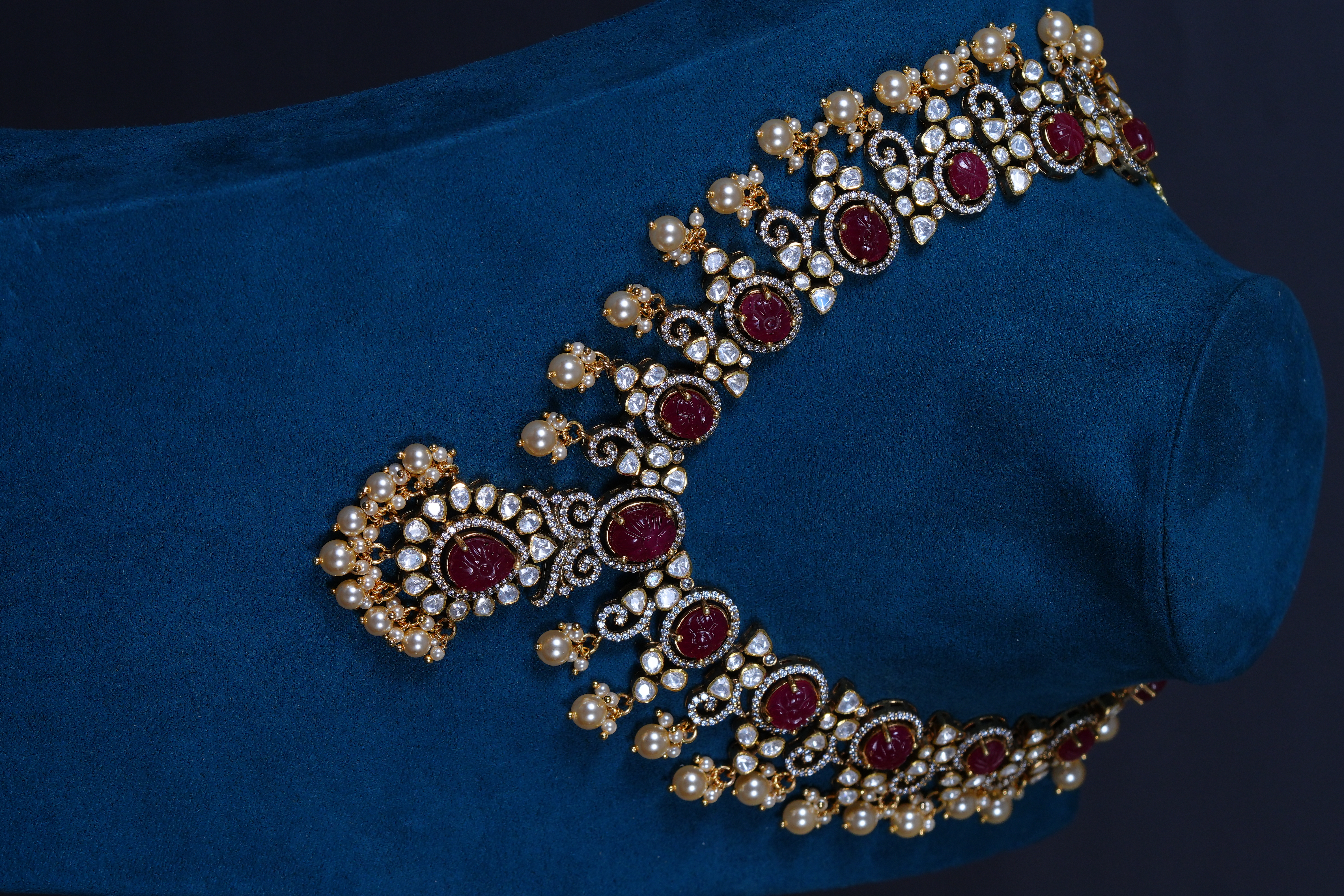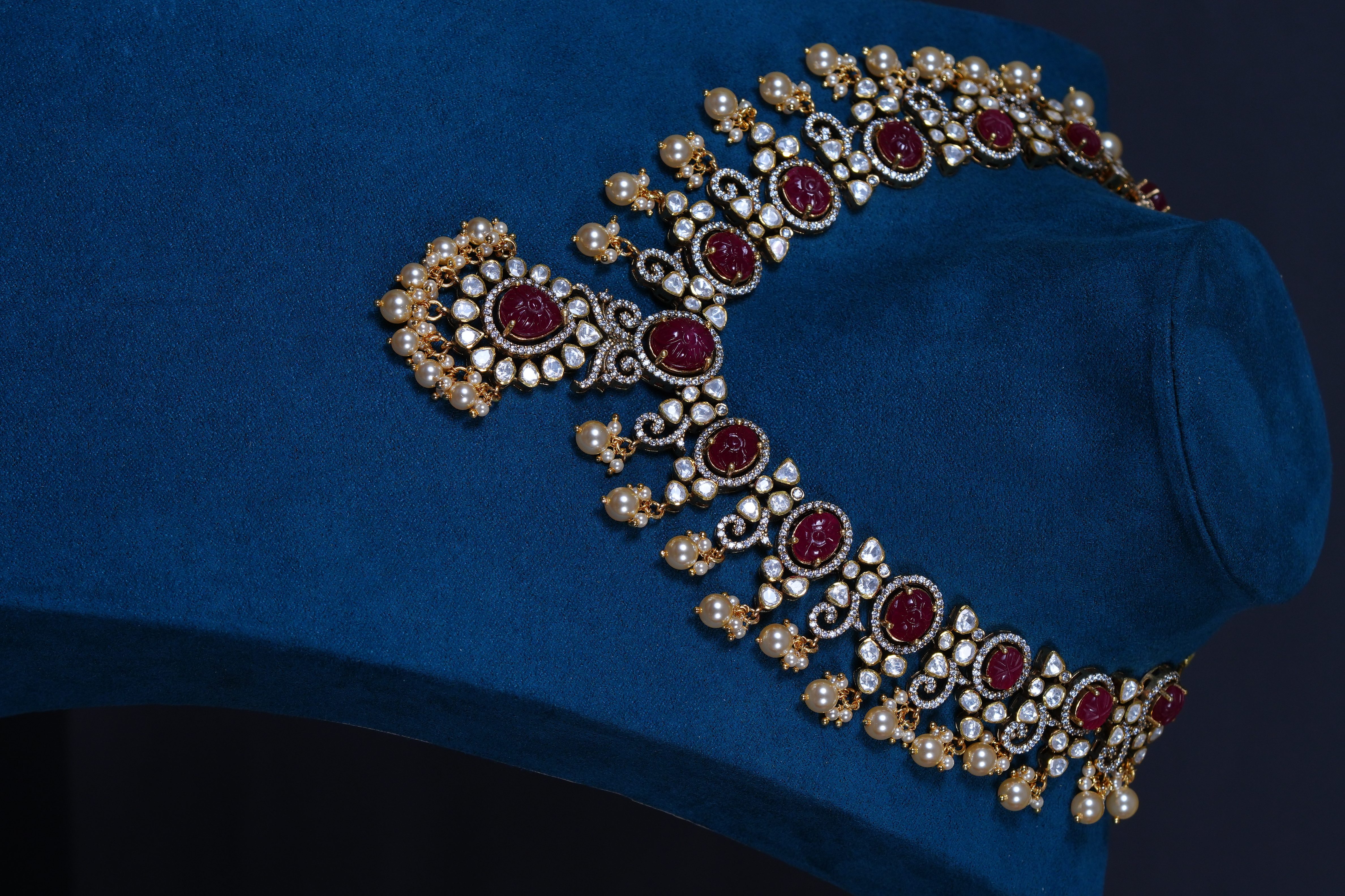 Royal Ruby Carved Polki necklace and earrings set crafted in 92.5 sterling silver. A bold choker-style statement adorned with intricate detailing and elegant pearl accents, perfect for bridal and grand occasions.