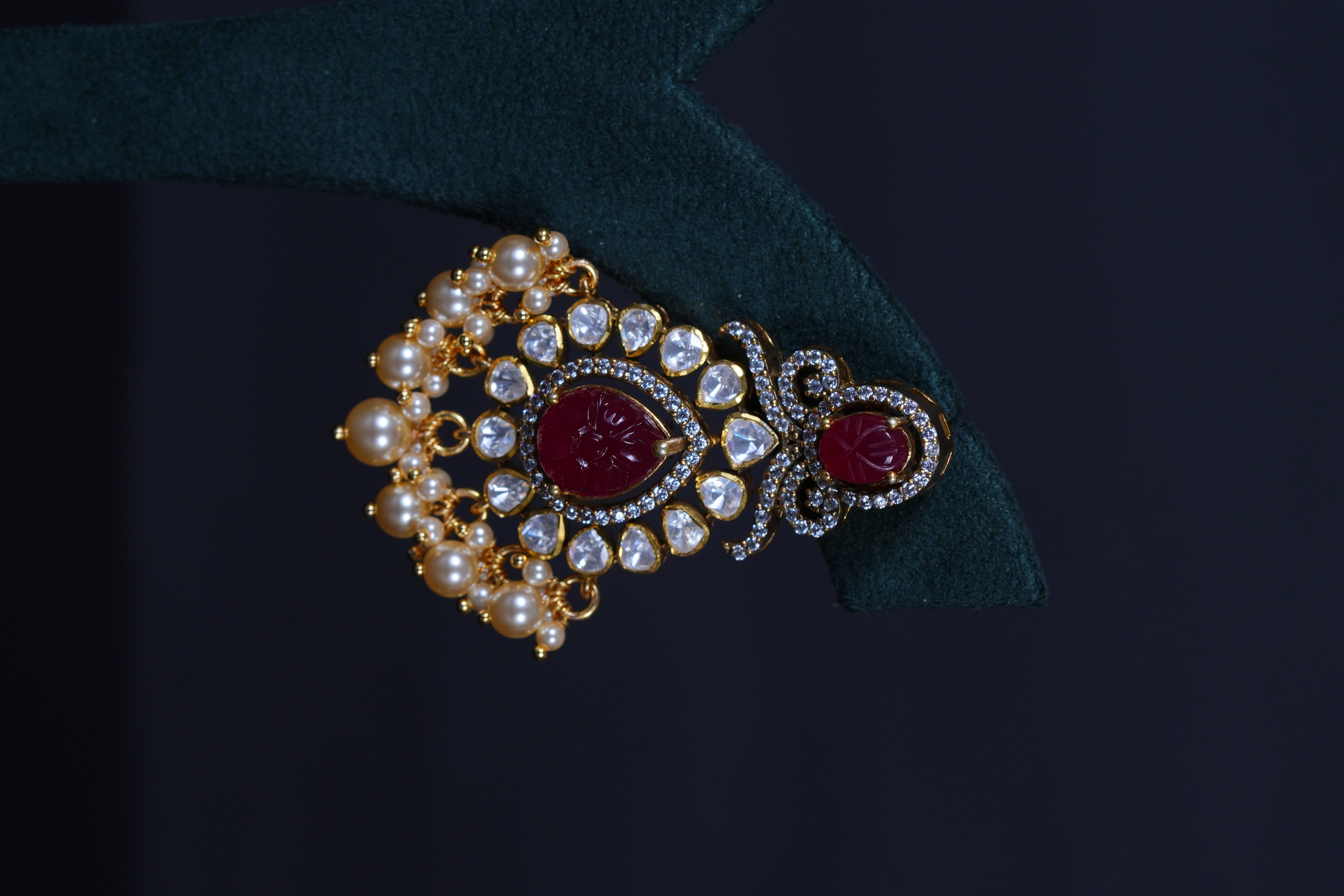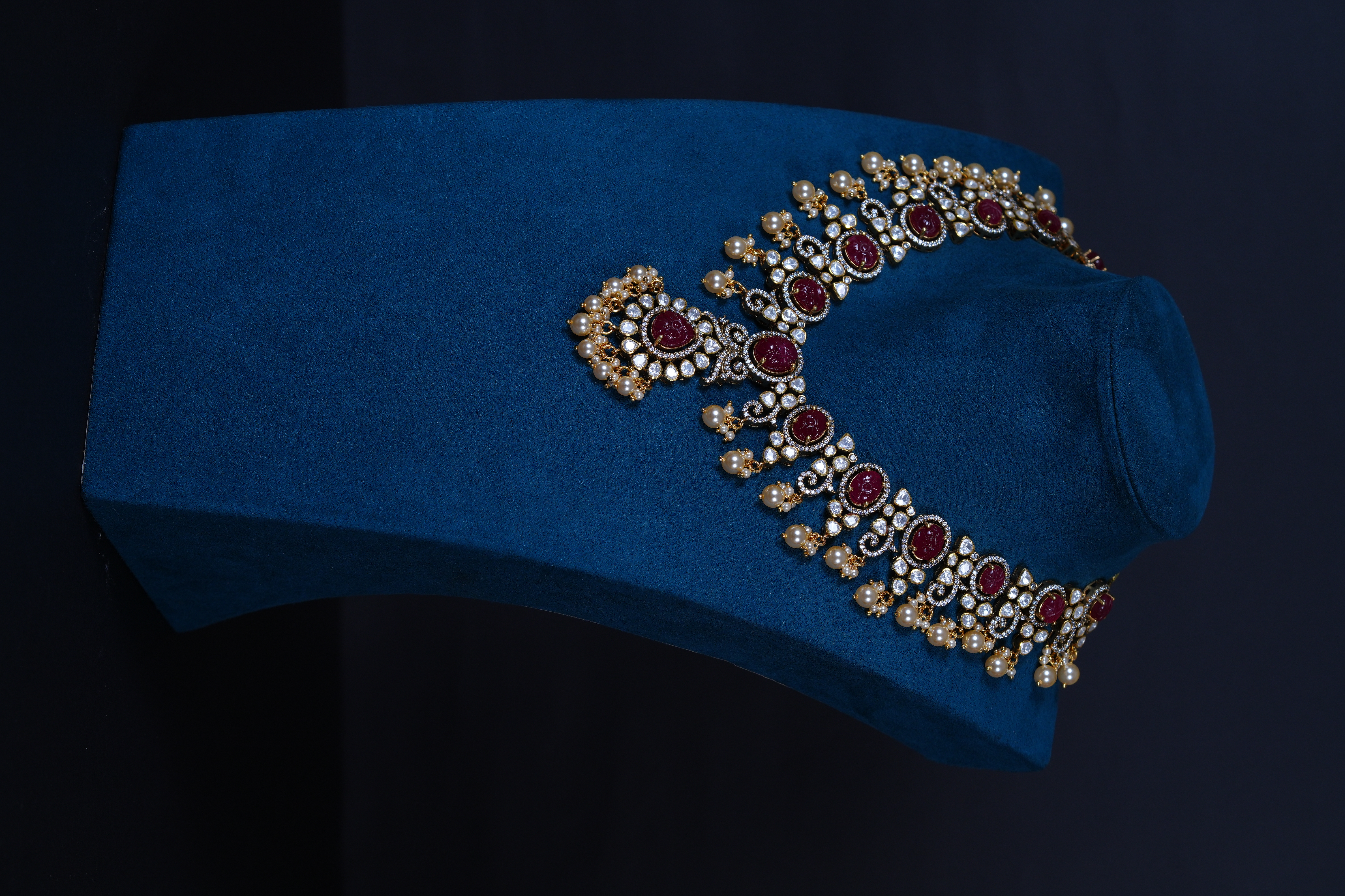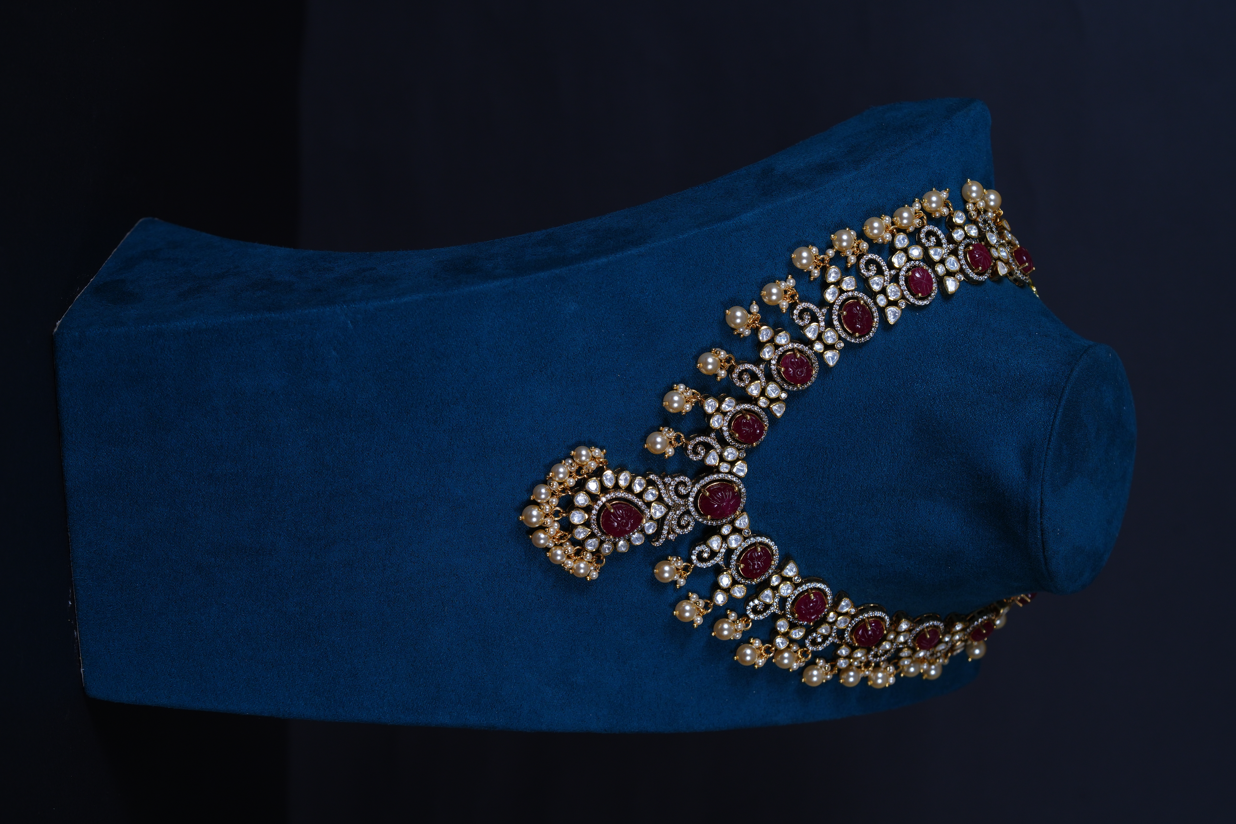 Royal Ruby Carved Polki necklace and earrings set crafted in 92.5 sterling silver. A bold choker-style statement adorned with intricate detailing and elegant pearl accents, perfect for bridal and grand occasions.
