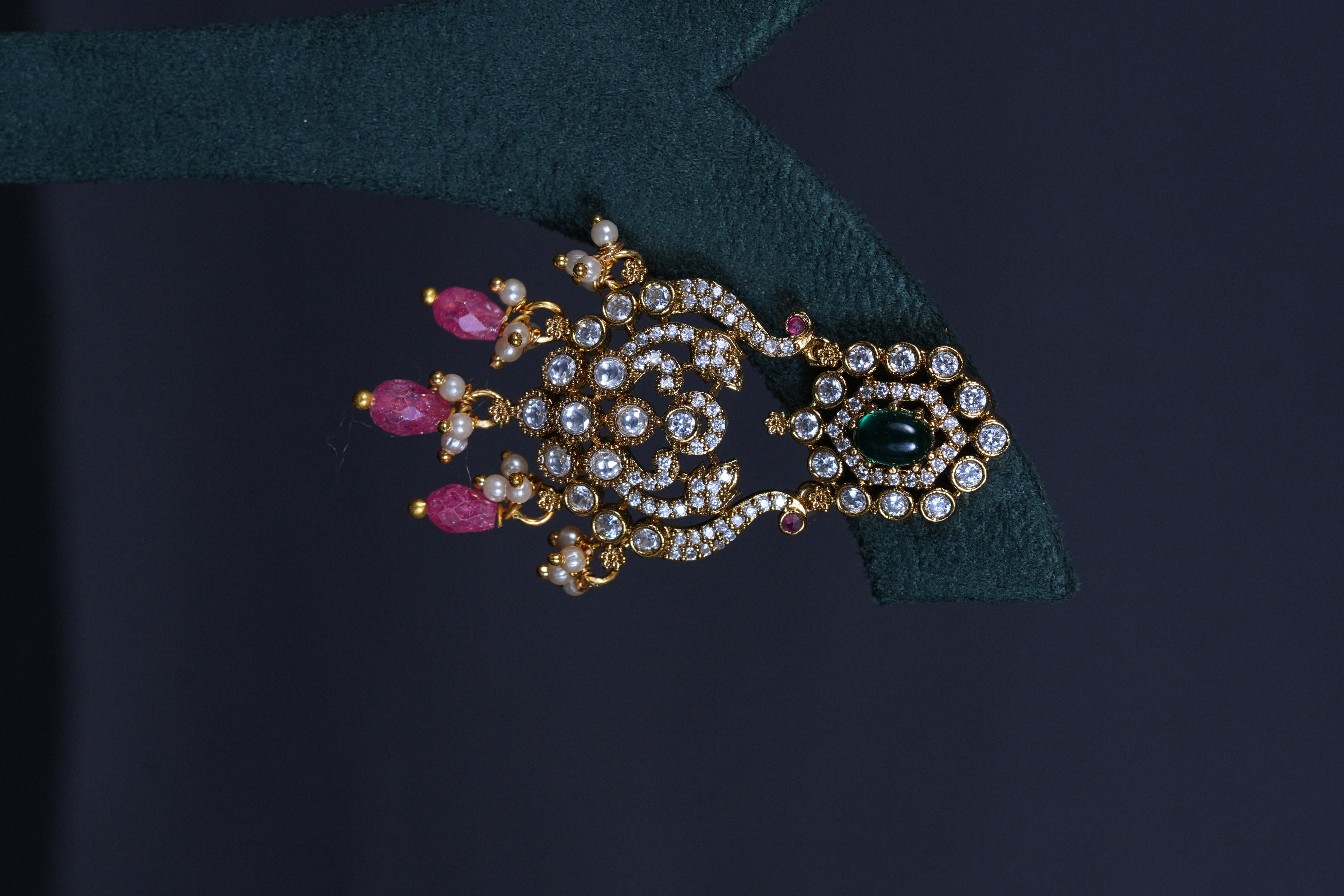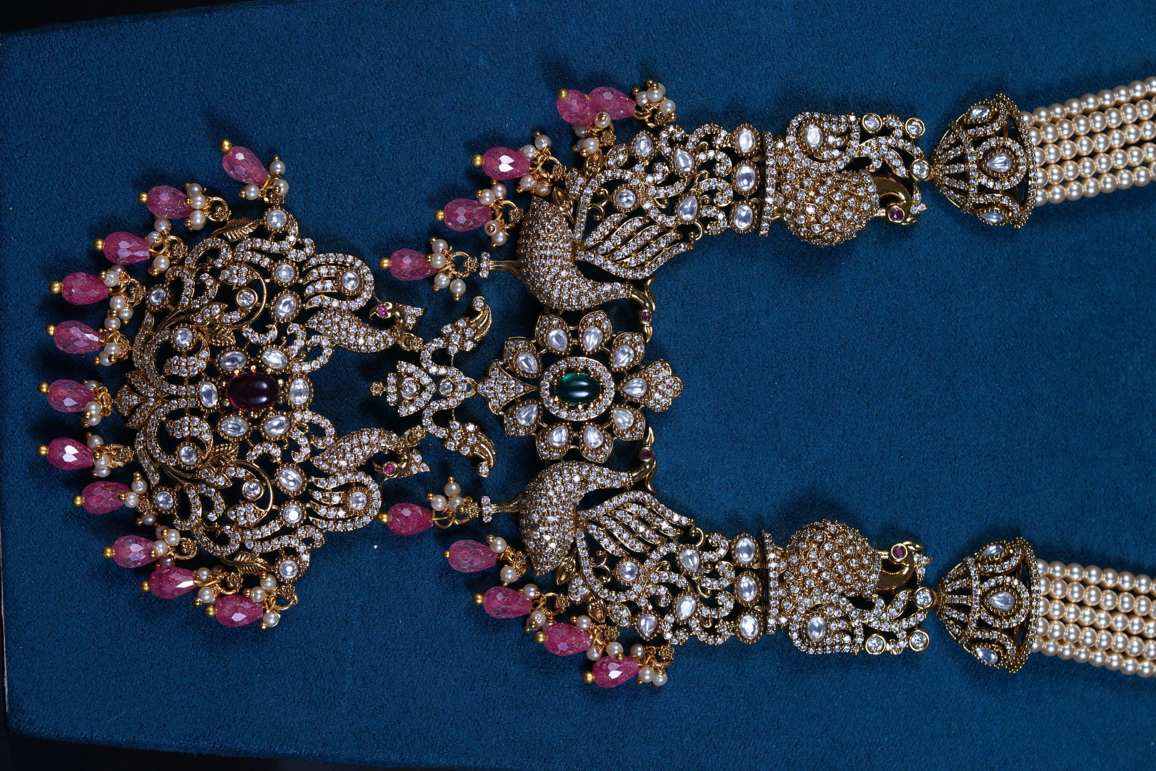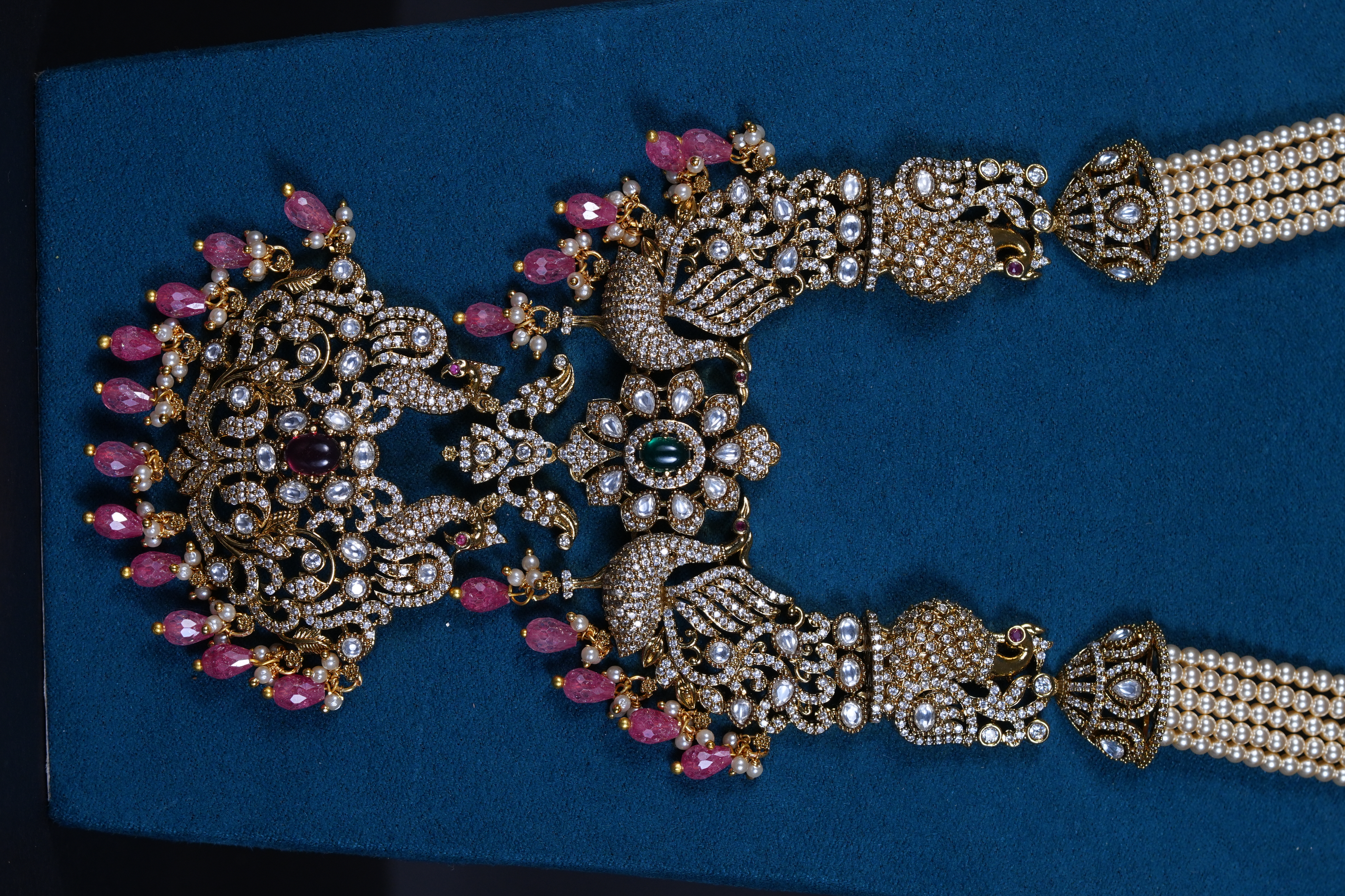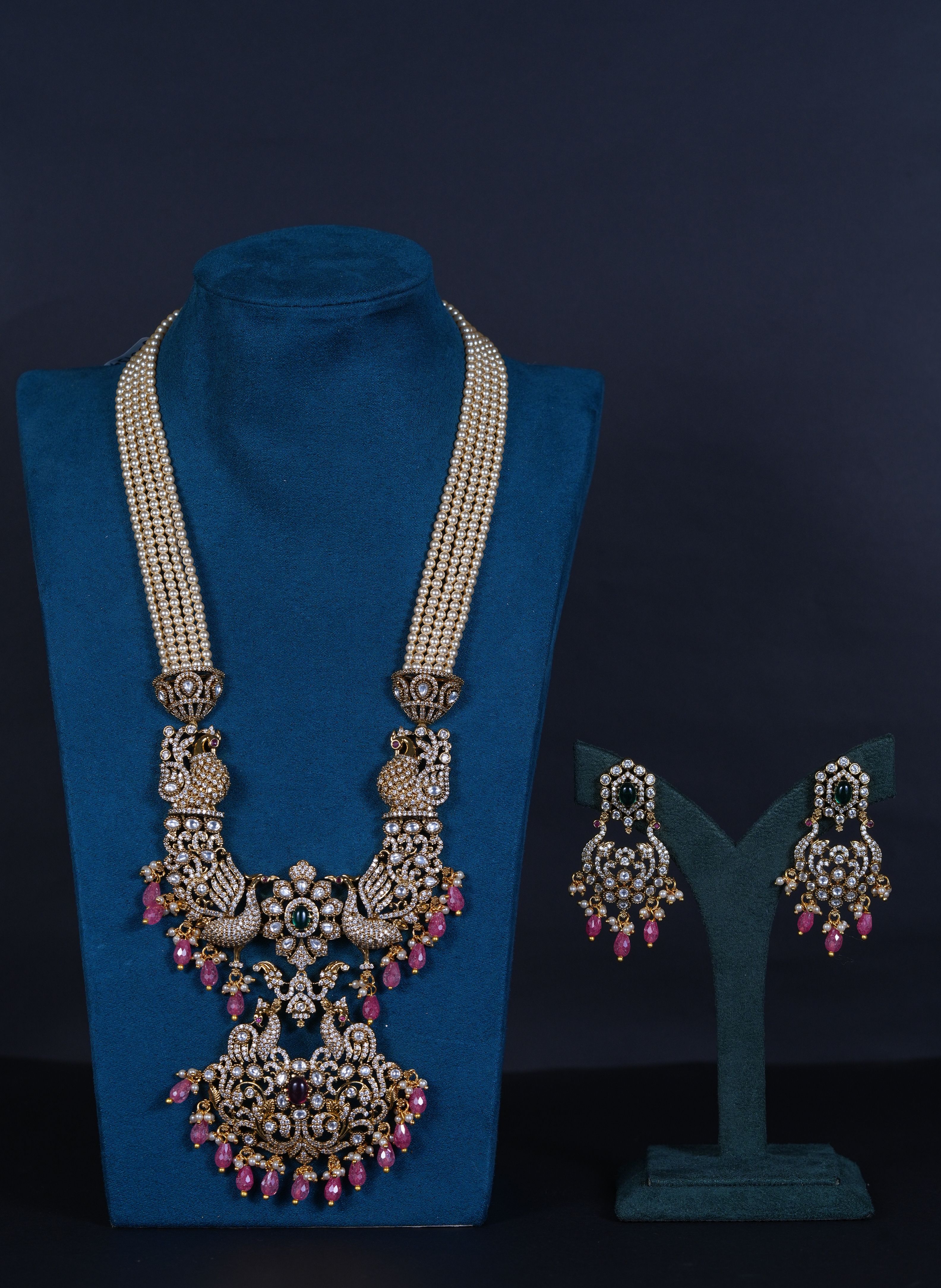 Royal Victorian peacock pendant necklace with pearls and screw-back earrings. An elegant imitation jewelry set featuring intricate detailing, perfect for weddings and festive occasions.