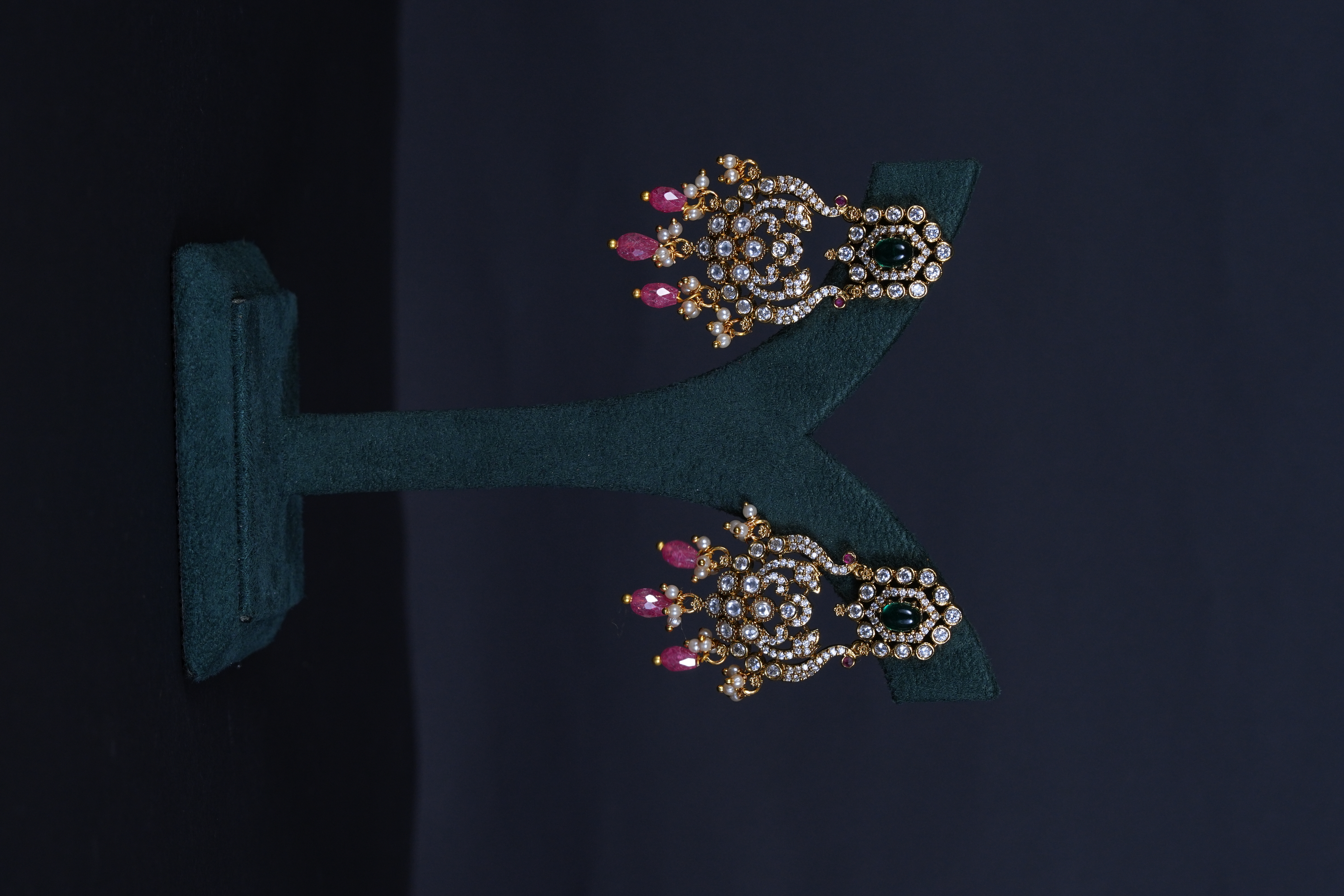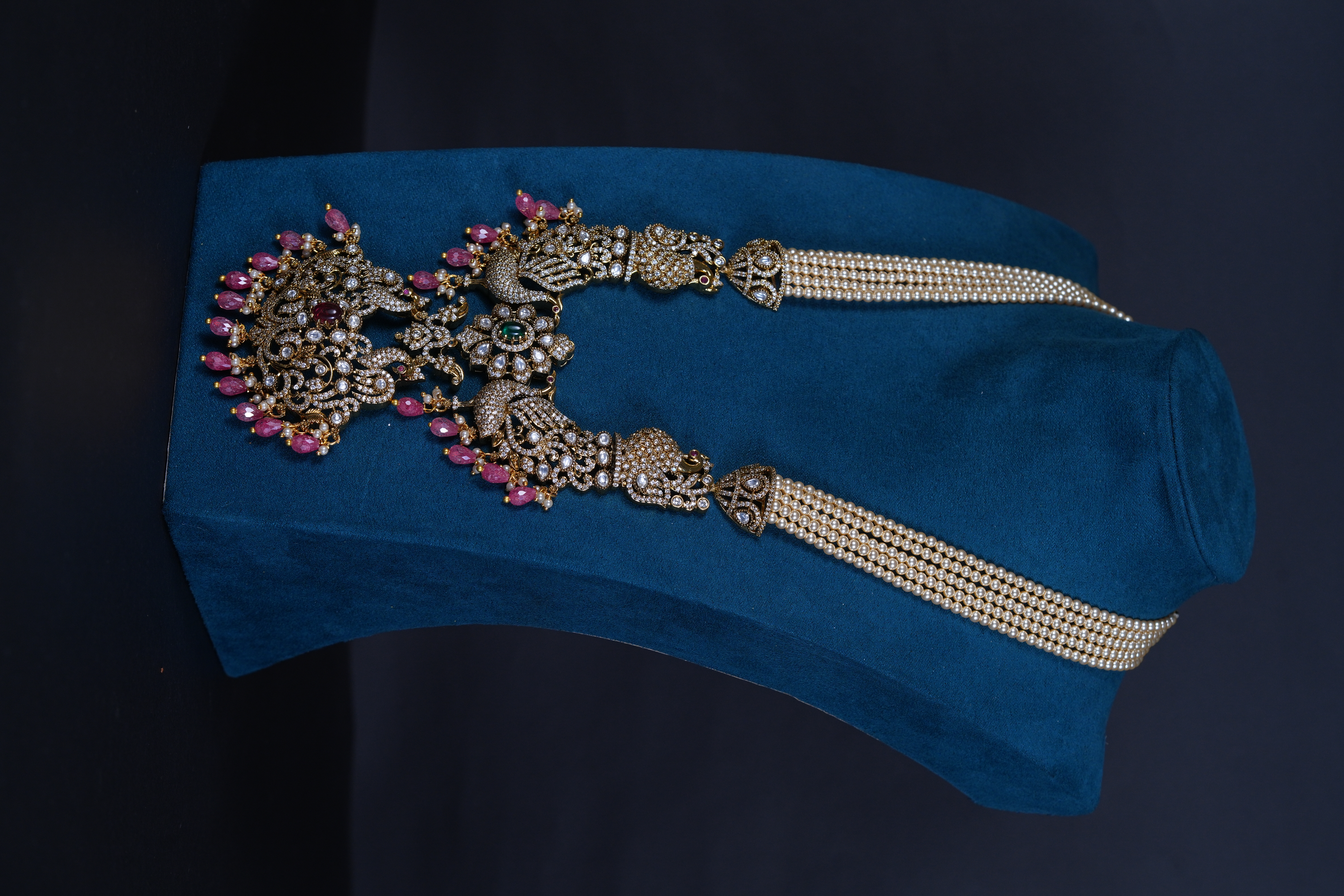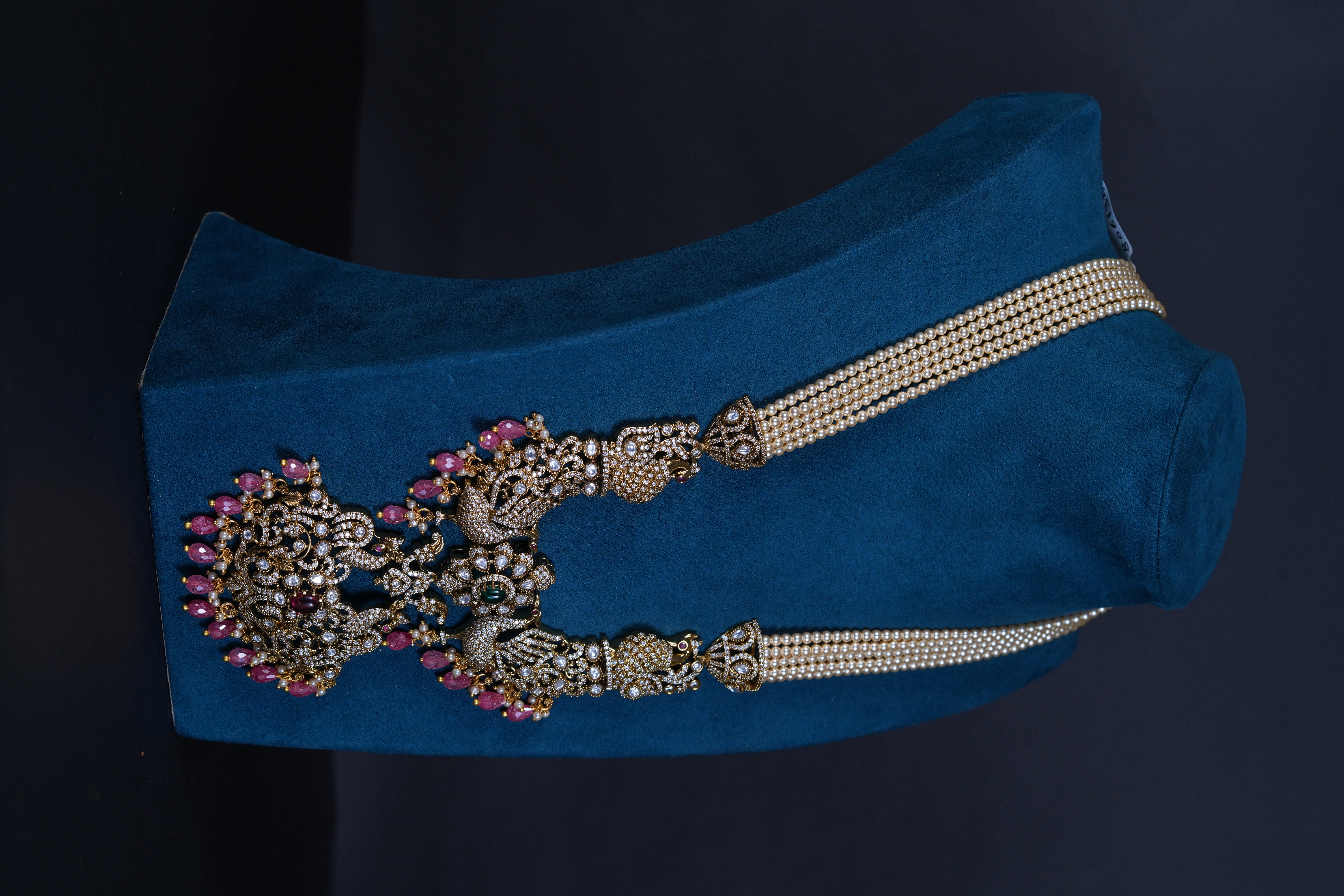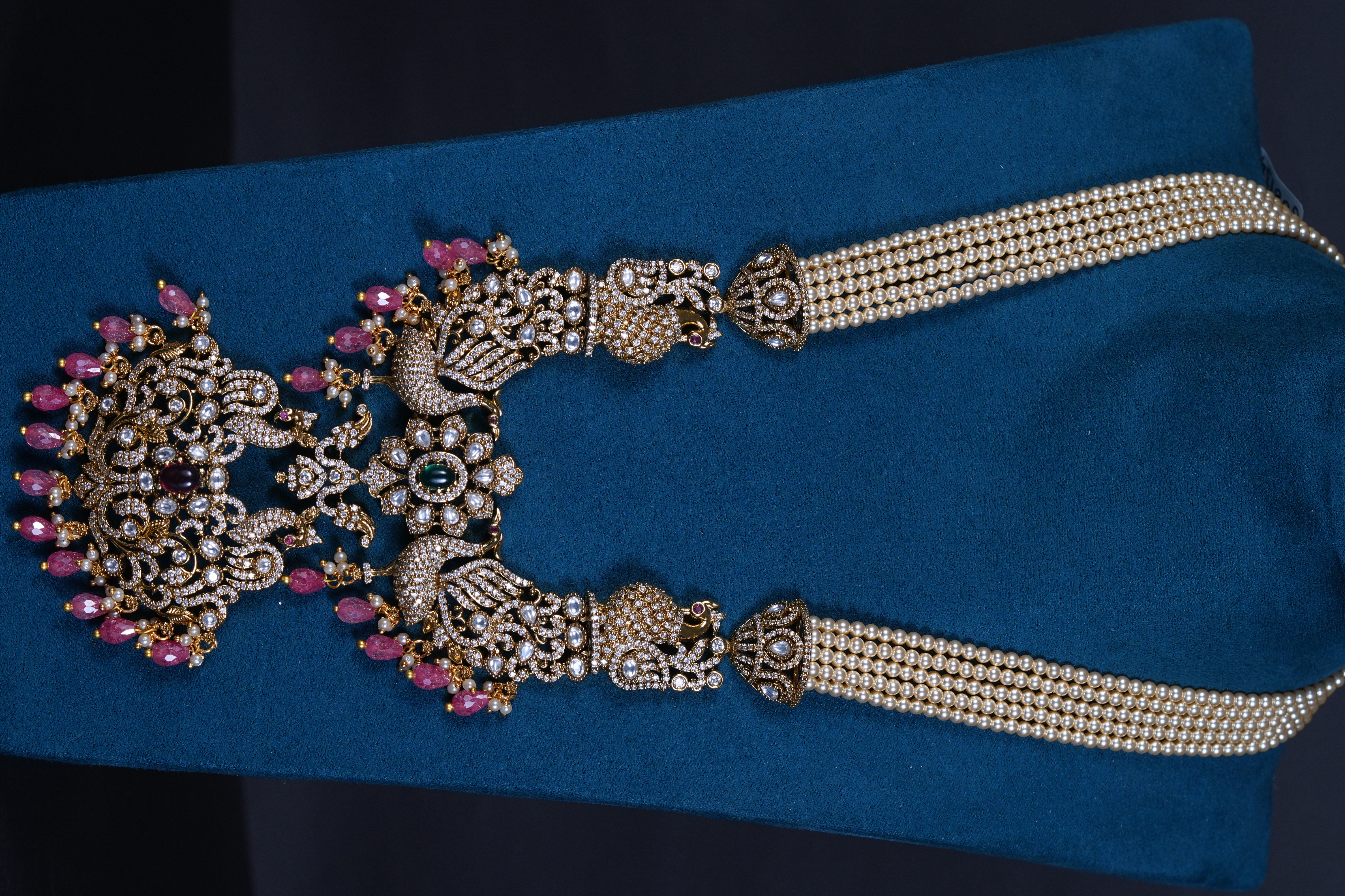 Royal Victorian peacock pendant necklace with pearls and screw-back earrings. An elegant imitation jewelry set featuring intricate detailing, perfect for weddings and festive occasions.